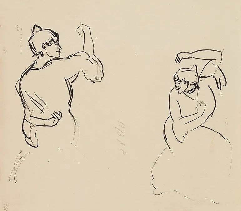 这幅创作于1901年的双面素描,是毕卡索“蓝色时期”早期的代表作,展现了他在不同主题和风格上的探索。一面,他以简洁有力的线条描绘了一位裸体女性,姿态自然放松,略带忧郁,体现了毕卡索对人体结构的深刻理解以及对“蓝色时期”氛围的把握。另一面,他则以流畅的笔触捕捉了两位西班牙舞者的动态和神韵,舞裙的褶皱、手臂的摆动都充满了节奏感和生命力,展现了他对西班牙文化的热爱和对瞬间动态的卓越捕捉。这幅双面素描不仅是毕卡索早期艺术生涯的重要见证,也体现了他创作上的多样性和实验精神。
