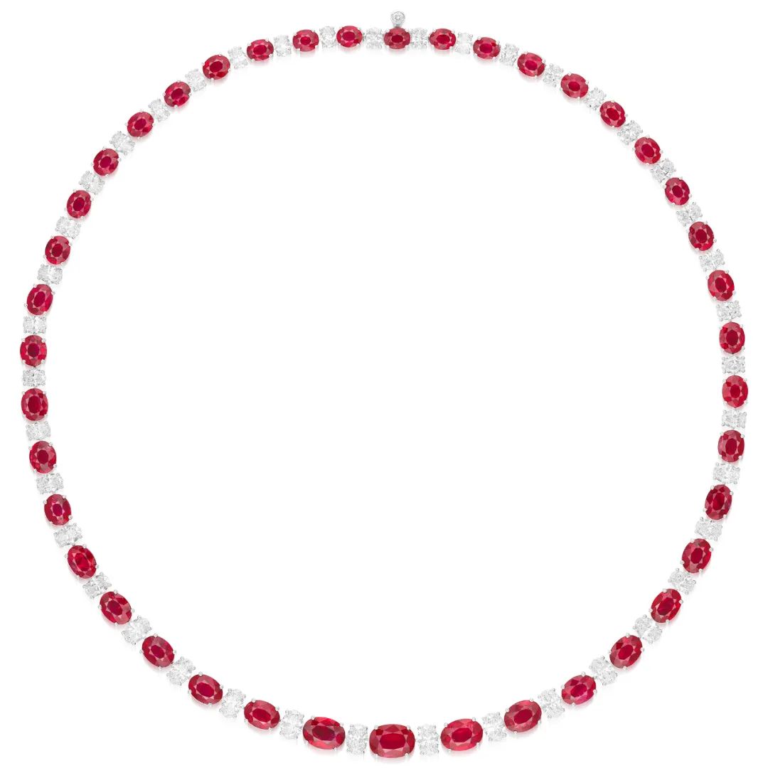 这条奢华的红宝石项链由41颗渐变椭圆形红宝石串联而成,总重约30.98克拉,每颗红宝石以钻石相间,赋予整件作品典雅流畅的韵律,长度约400毫米。