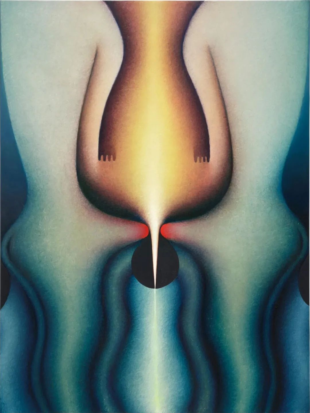 这幅画作首次亮相是在其售罄的个展《母语(Mother Tongue)》中,标志着她融合绘画与雕塑元素的混合技法之开端。作品同时汲取了艾格尼丝·佩尔顿(Agnes Pelton)和乔治亚·欧姬芙(Georgia O’Keeffe)等先驱女性艺术家的创作遗产,融入了精神象征与感官形态,呼应其标志性的视觉符号。