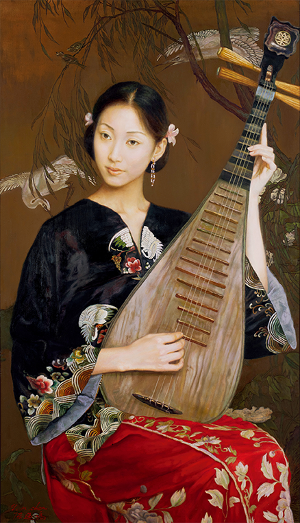 画中的古装美人手持琵琶,顾盼之间婀娜多姿,笔触细腻,维妙维肖,展现出东方女性温婉柔美的性情和清丽脱俗的气质,融东方文化底蕴与西方绘画技巧于一体。