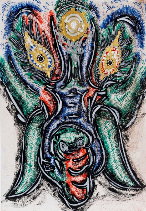 此作构图大胆,色彩绚丽,笔触粗犷,刻画象形神兽,象身满布祥云,一对充满灵性的大眼睛注视着观者。这一时期的艺术家以神兽为主要创作题材,借此重新审视神灵与人类之间的关系。