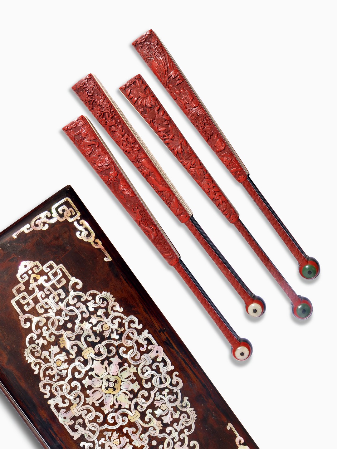 剔红会昌九老图、云龙纹、九秋图、荔枝纹扇骨一套四把