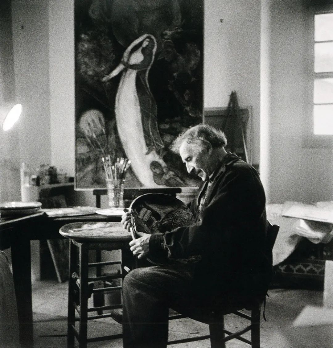 夏加尔1887年出生于白俄罗斯维捷布斯克,7岁入读宗教小学,《圣经》及其中插画为其认识世界、了解艺术的启蒙,后成为虔诚的基督徒。受巴黎自由的艺术风气所吸引,他一生两度由俄移居法国,巴黎成为他的「艺术故乡」,见证他走向与毕加索、马蒂斯齐名的大师之位。而其妻子的陪伴与支持、幸福美满的家庭生活更是他在动荡年代的精神支柱,与艺术创作的最大灵感来源之一。完成于1968年《我的家园》,可谓融合艺术家一生中最重要的所有元素——艺术、故乡、爱情与宗教。