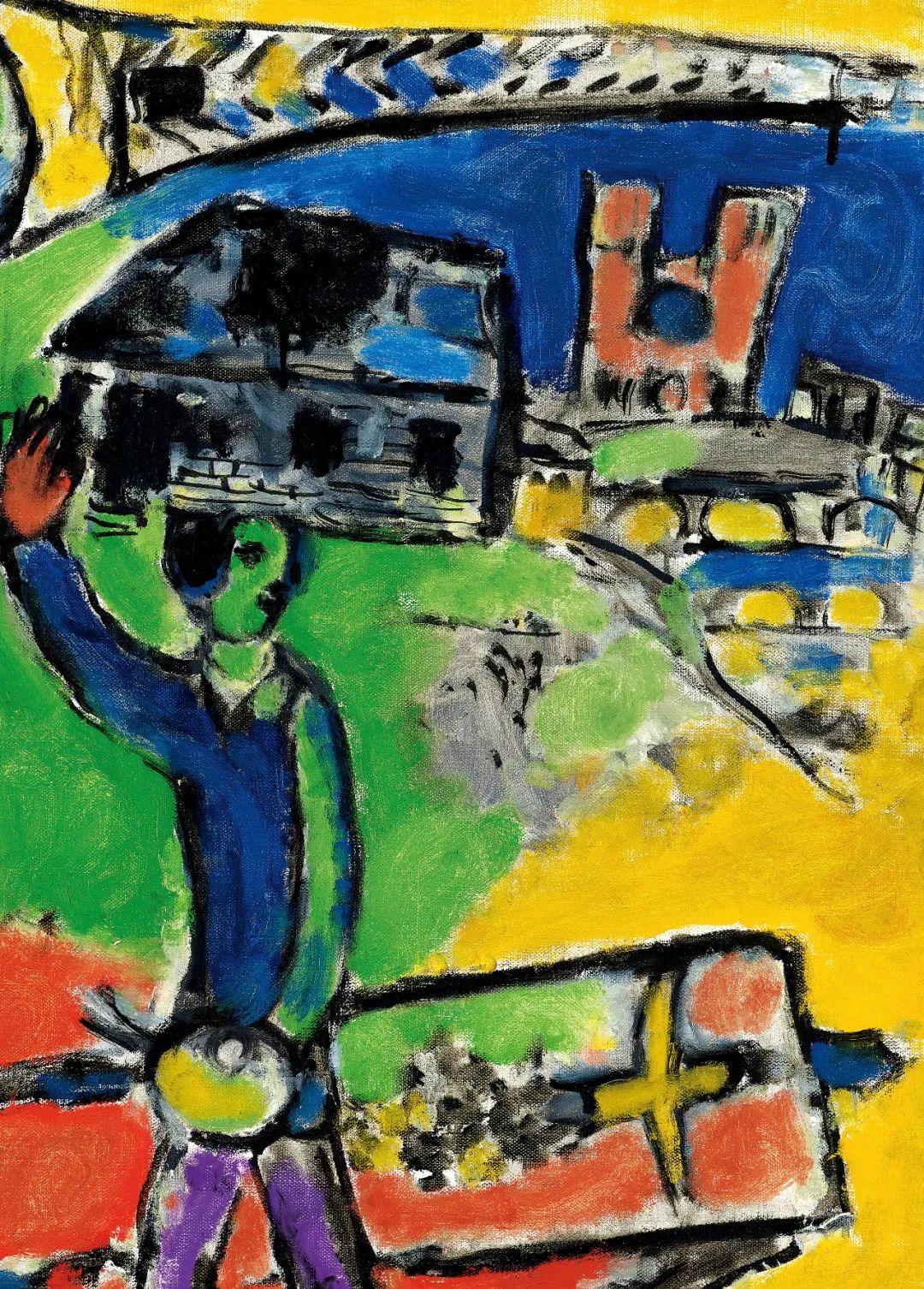 画面如同一旋转的调色盘,大胆使用高饱和度的原色:温暖的橙橘、光灿的柠檬黄、如茵的翠绿、闪电的靛蓝色彩如阡陌般以极具分量又松软的块体铺展,奏响欢欣的乐章。而在画作中心,见艺术家现实生活中标志性的卷发、拉长身体的人物,左手持调色盘,右手高举若向观众打招呼,欢迎我们进入他的世界。而画架上的画中画,以耶稣受难的形象,言说了夏加尔的基督教信仰,以及愿为艺术投身一切、燃烧的热情。