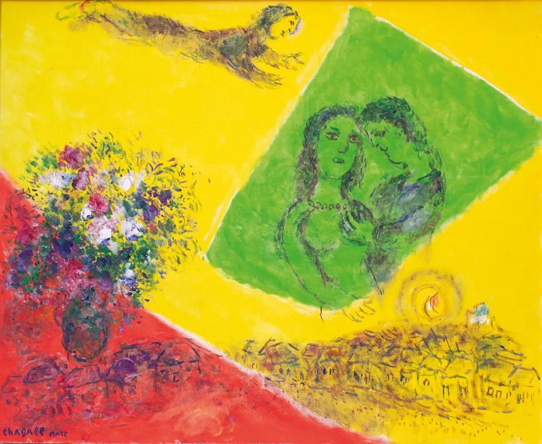 夏加尔《绿色广场上的恋人》,油彩画布,60 × 73cm,约 1970- 1975 年作,拍卖成交价 1310 万港币