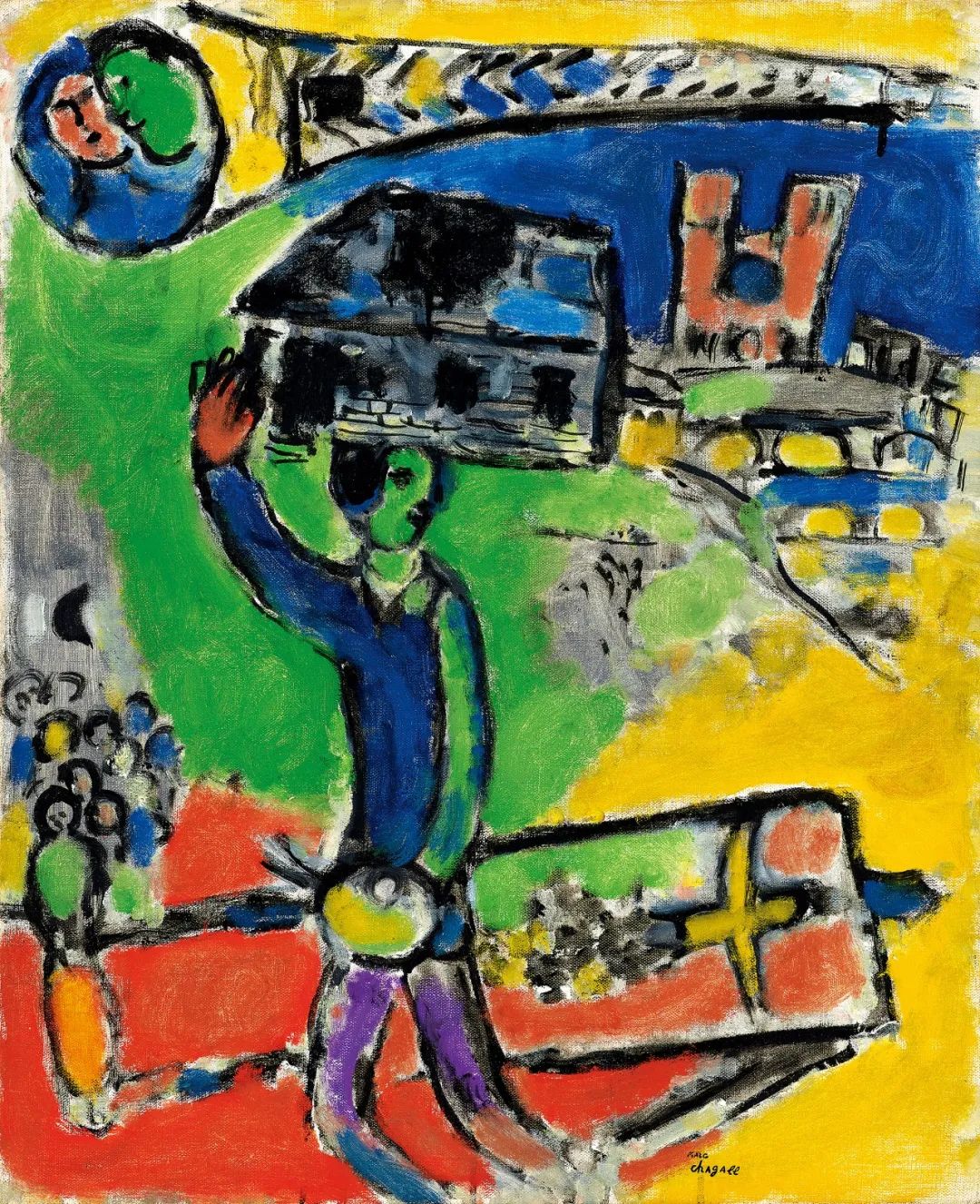 而主角头顶可见简朴的单层砖房,此指涉其于白俄罗斯的老家,而至右,空间一下跳动到巴黎著名的圣母院、新桥,流露出超现实的情味。而在天空处艺术家出人意表地将原本水平的地平线拉成垂直,构绘了一象征工业革命结晶的巴黎铁塔。