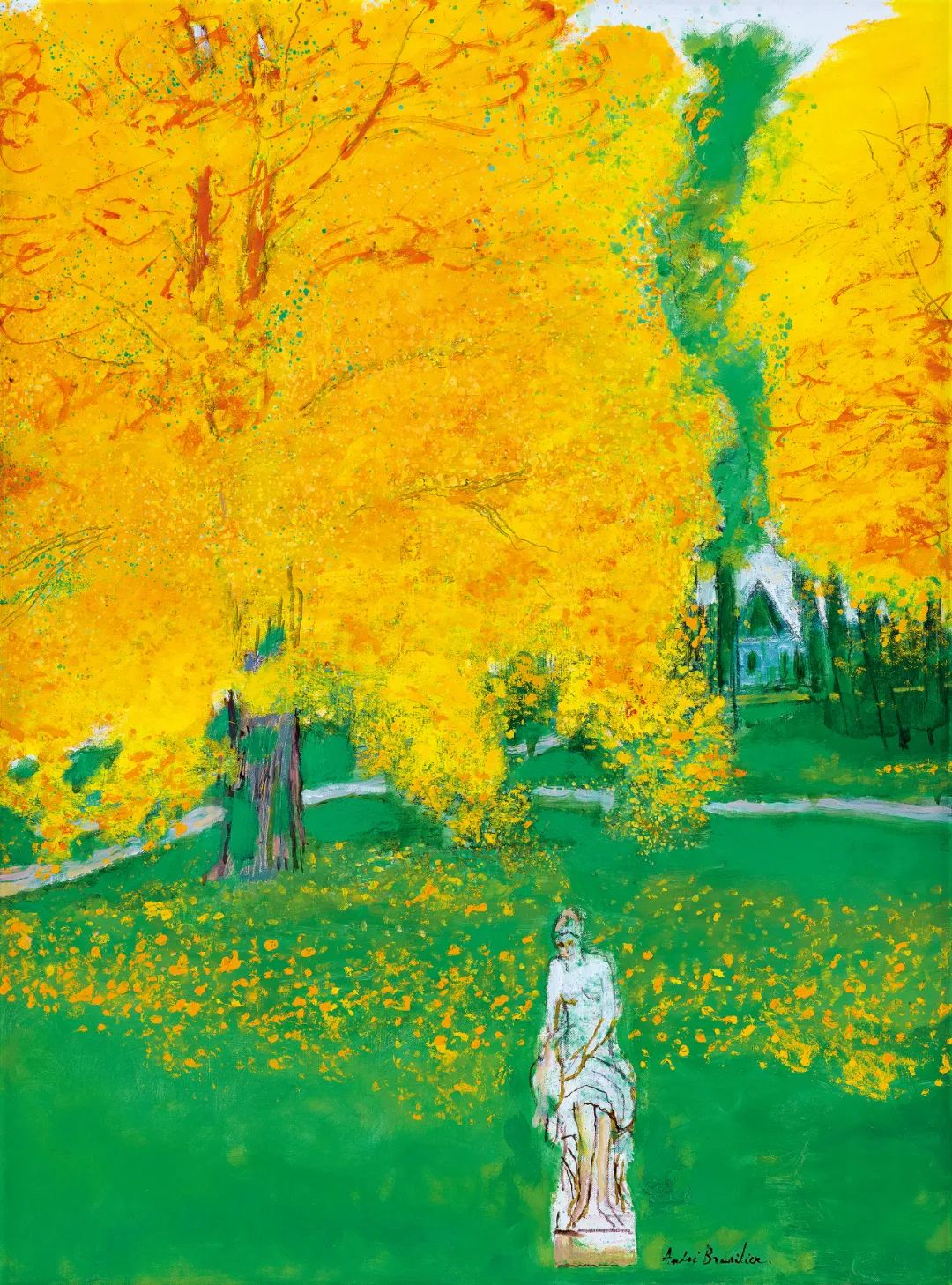 布拉吉利为巴黎画派仅存的在世大师,其创作融合野兽派的浓烈色彩、浮世绘的线性勾勒与中国水墨的留白意境,形成独特的「法式抒情抽象」风格。作品《卢佩涅公园》以极简的黄、绿、白三色构建画面,通过象征性色彩与超现实构图、跨越东西方美学的和谐表达,传递对自然与生活的热爱。