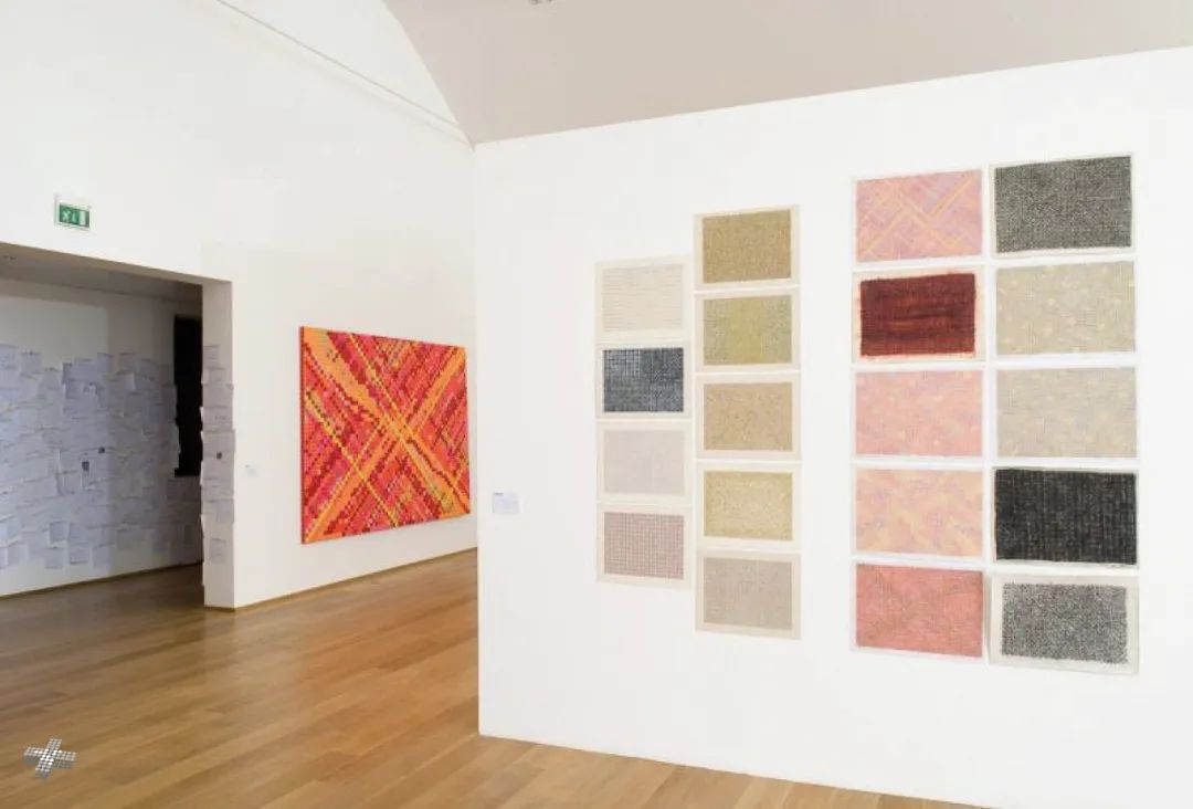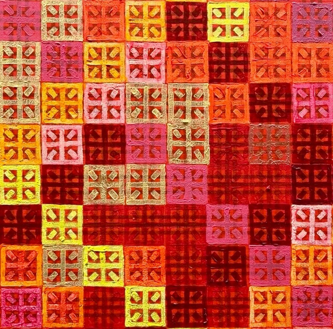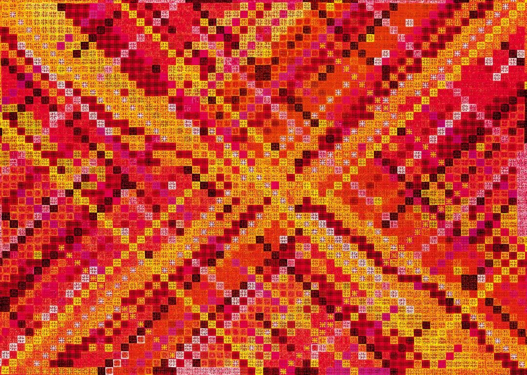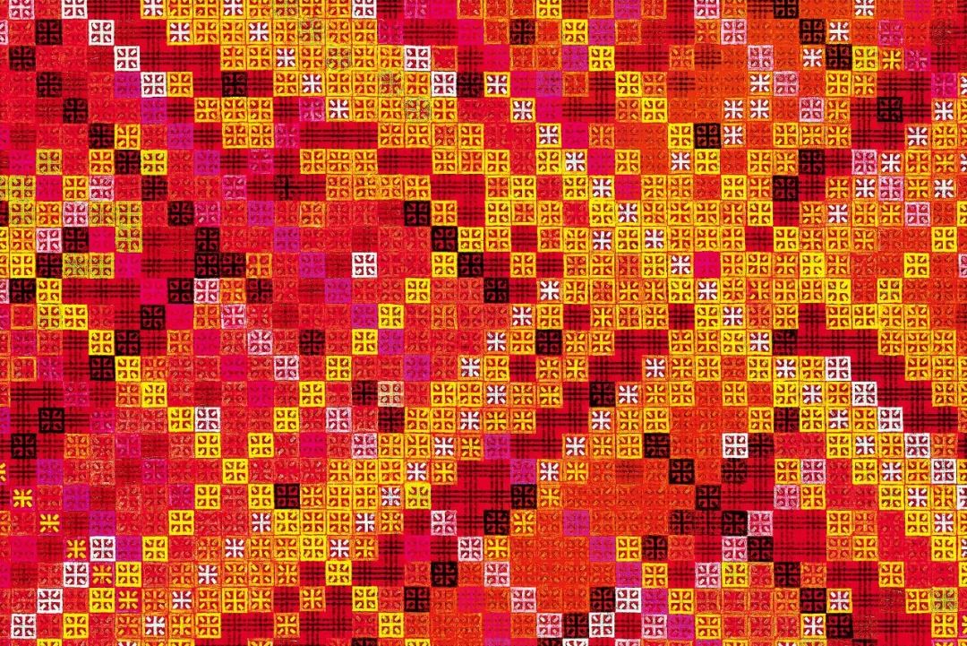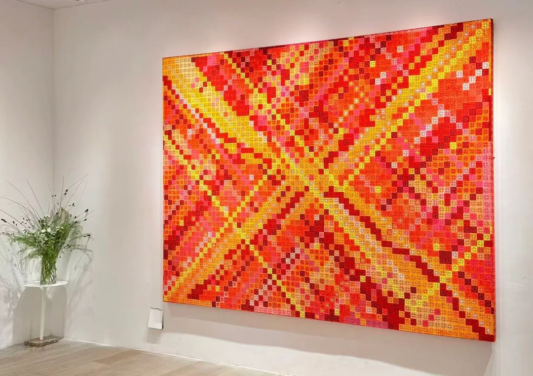 丁乙在此特选一苏格兰格子布为基底,在其上纵横捭阖,以明艷而温暖的红、黄色调为主轴,缜密而有序地在其中排布起每个长宽约4公分的小方格来打破基底的格布图像逻辑,其上加以3500个象征标准与定位的「+」与「×」所构成「米」字符号,透过单色或双色的联合经营,在连绵不绝的累积间,构建出我们眼前所见的恢弘盛景!
