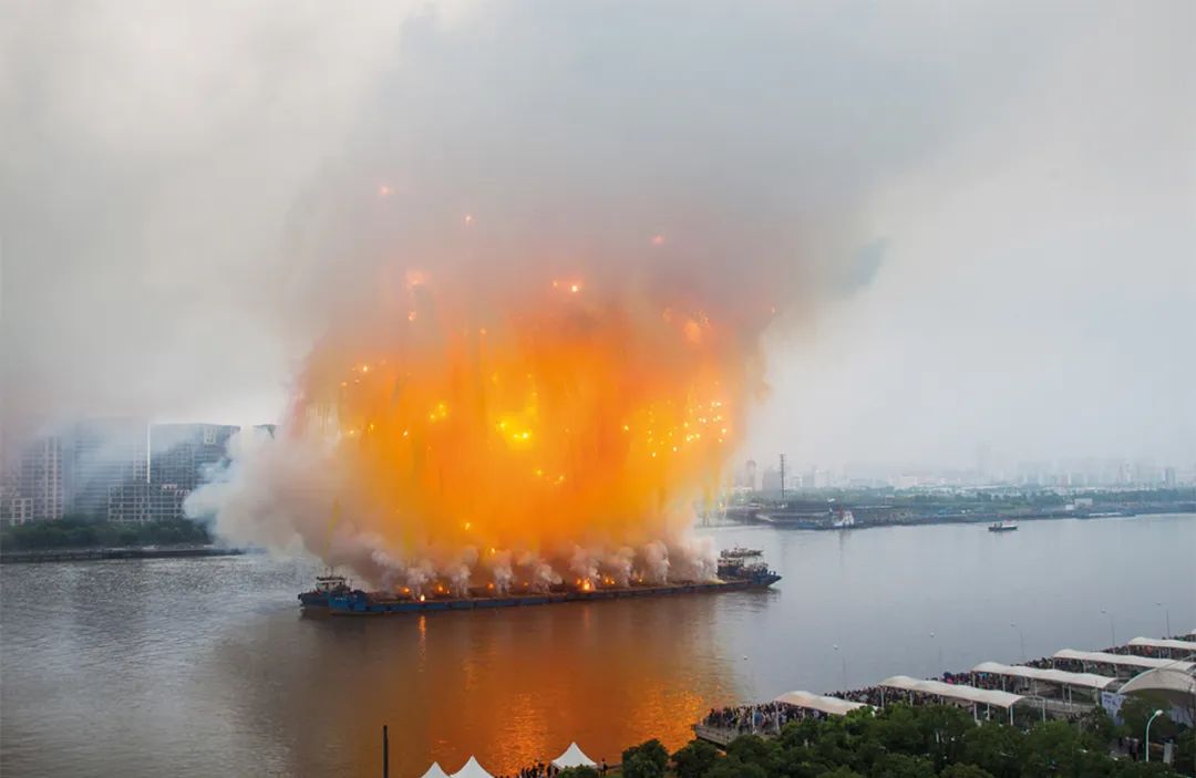 上:2014年蔡国强于上海当代艺术中心举办「九级浪」个展中的《白天焰火》演出,是于上海黄浦江实现的水上爆破项目©caistudio