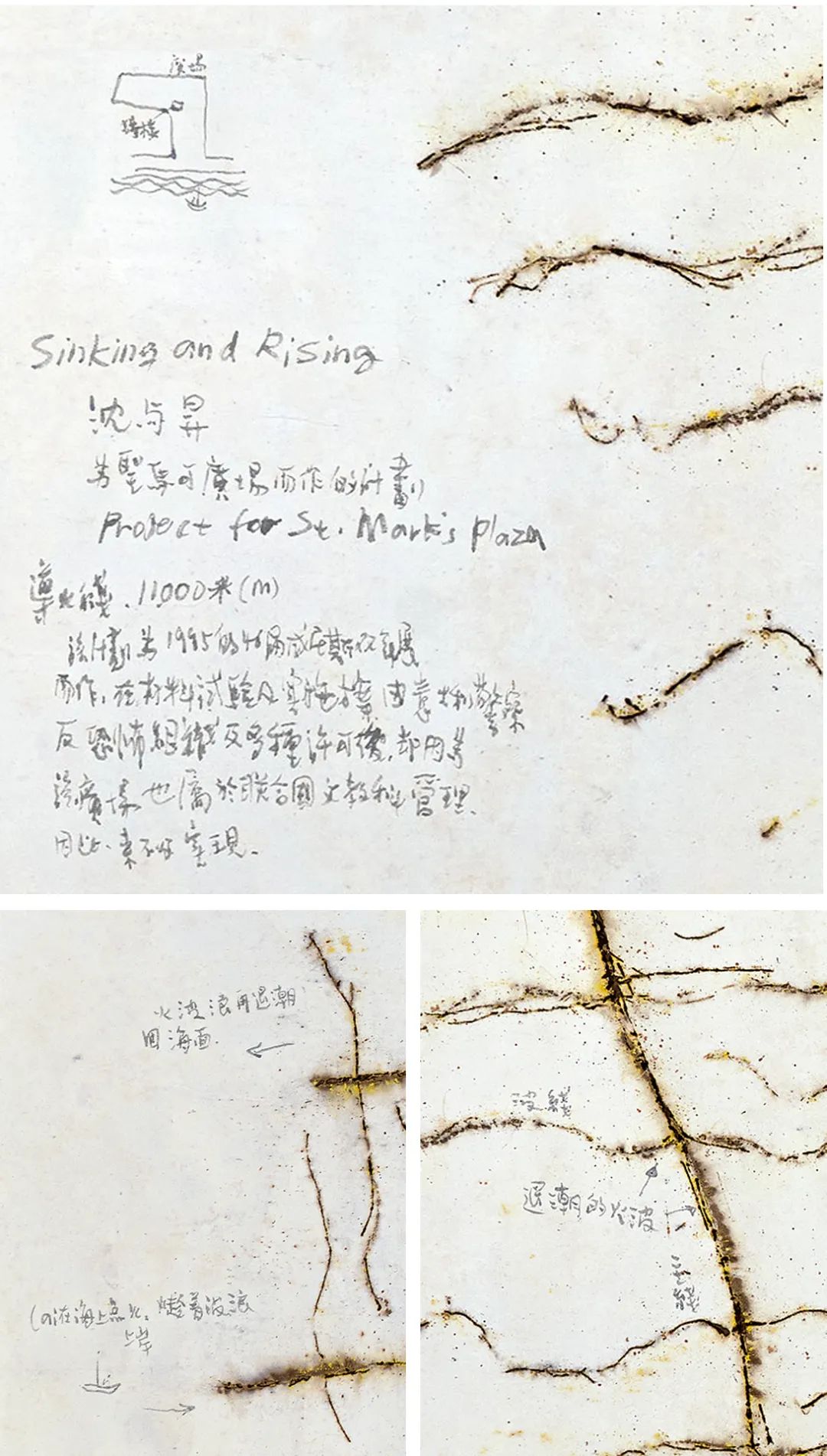 作品兼具「设计图」的理性与火药爆破的偶发美感。画面四周有蔡国强以墨水手绘的圣马可广场地形轮廓及以箭头、文字标注爆破路径,如「主线」、「波线」、「Cai在海上点火,火趁着波浪上岸」、「导火线以每秒20-30m的速度奔驰」,详细标明了爆破的路径、方向、速度与规划逻辑,展现如工程师般的严谨。