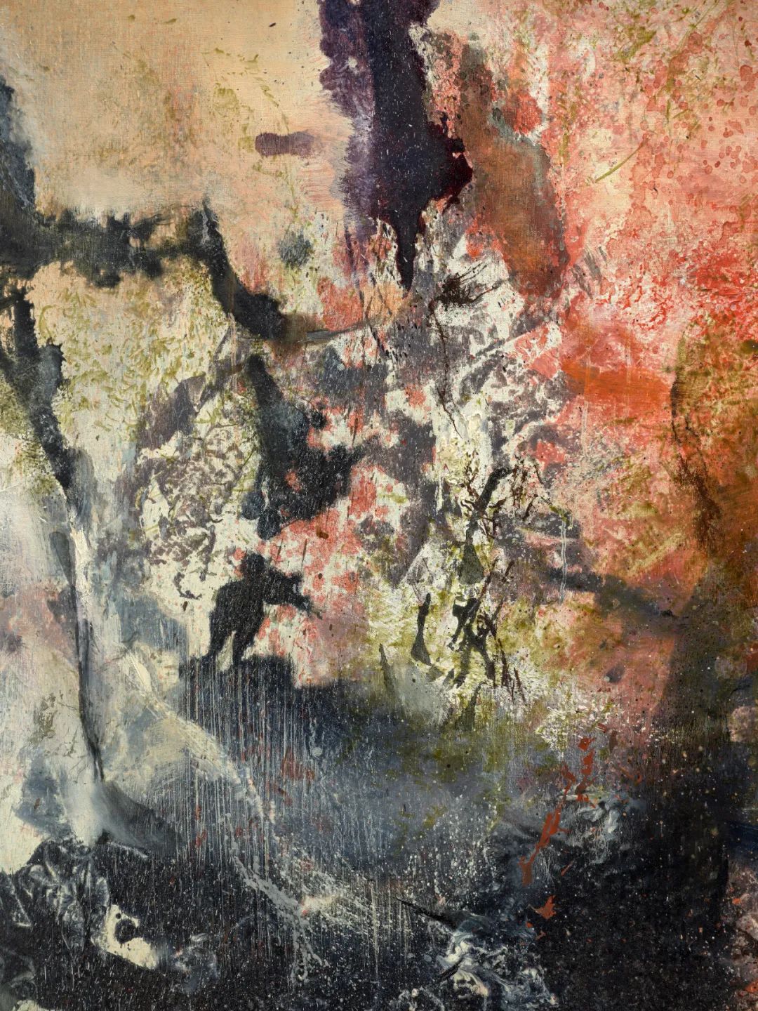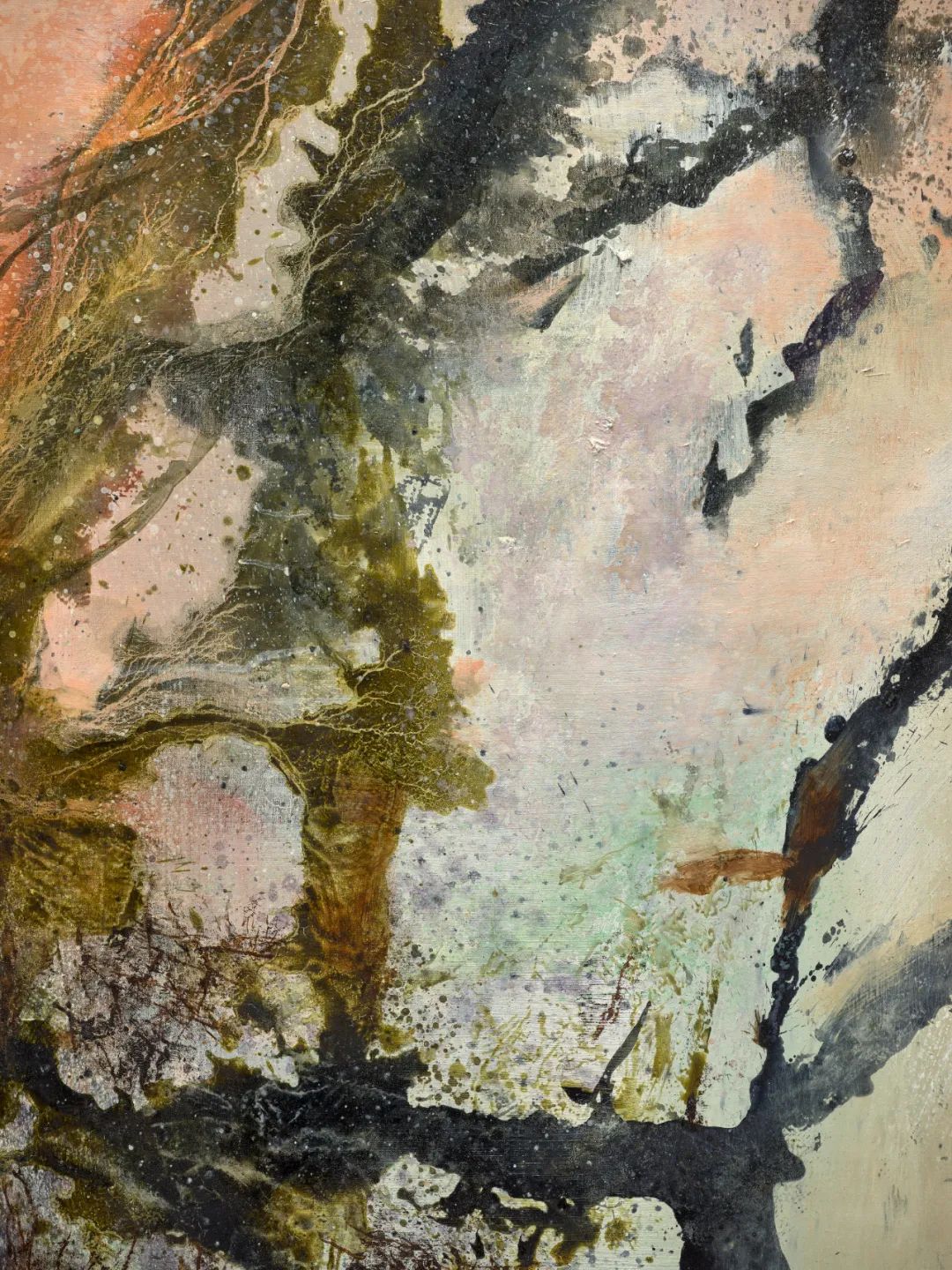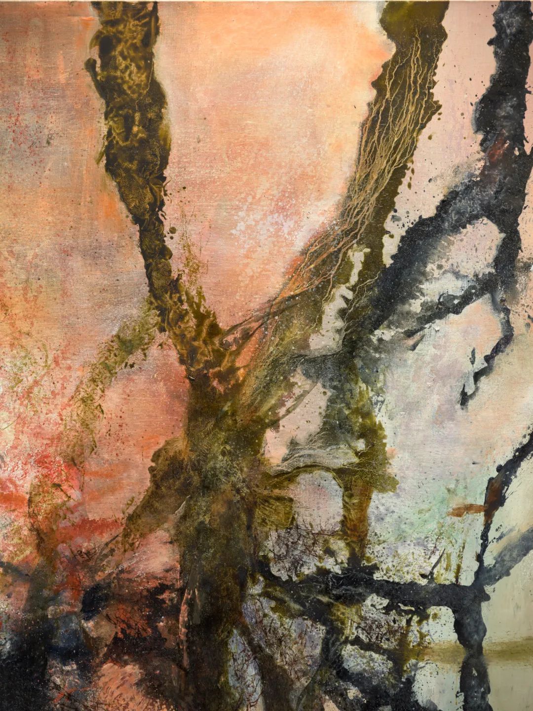 而流光氤氲的背景则体现阴柔之韵,二者交融,打破二元对立,构成一种强大的平衡,诠释了道教“太极”相生相济的哲理。这幅抒情抽象之作将深邃哲思与视觉诗意融为一体,在对立的力量间达成一场浑然天成的共舞与平衡。