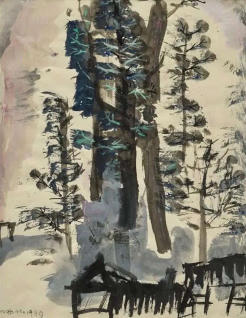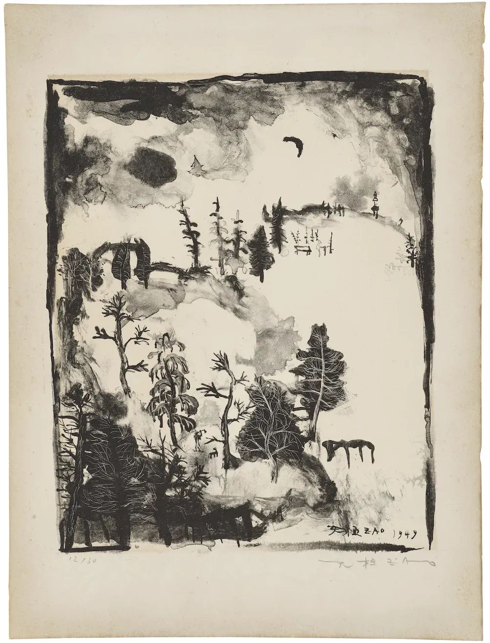 1981年,赵无极携夫人造访台北,与会中国画坛巨擘张大千。张氏以豪泼墨法闻名,赠赵数幅传统山水立轴,令赵深获启发。