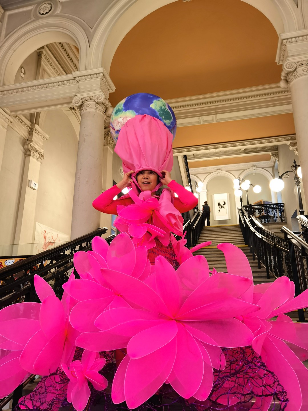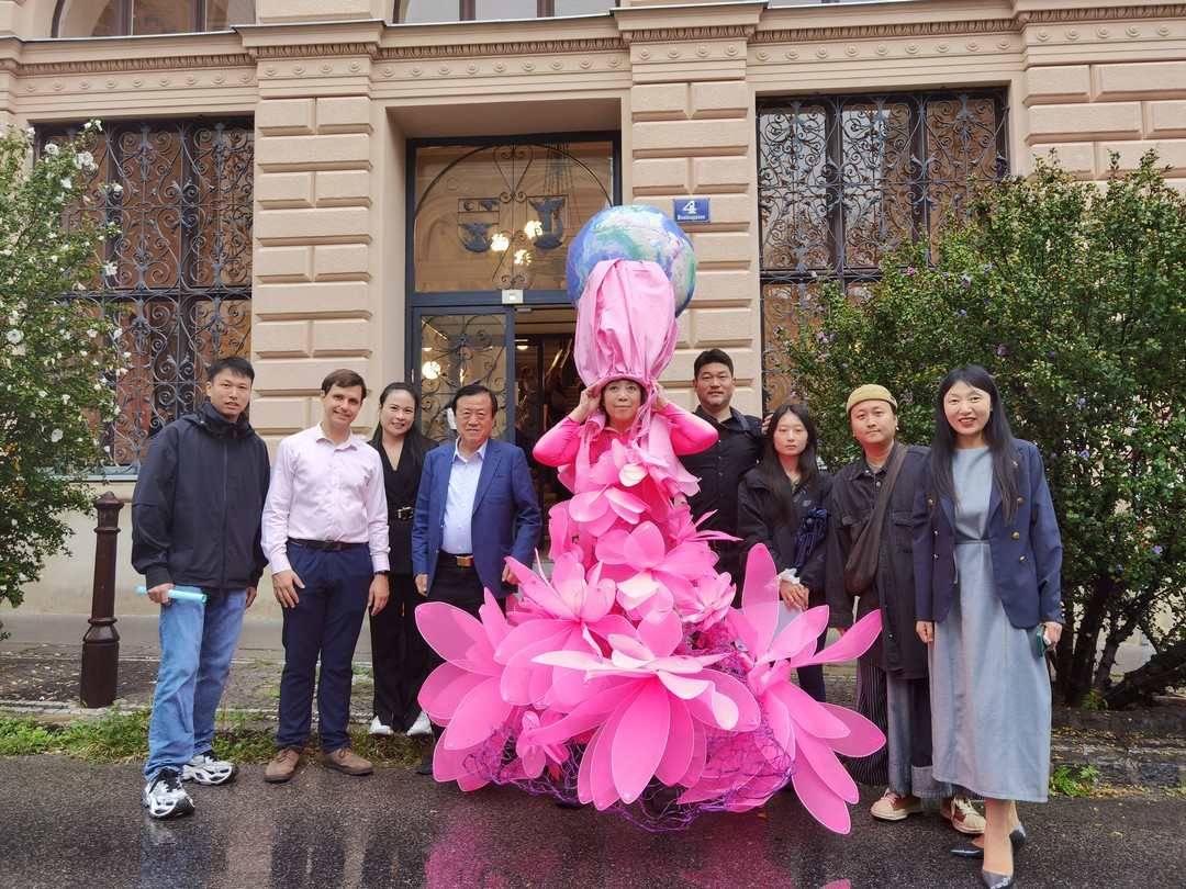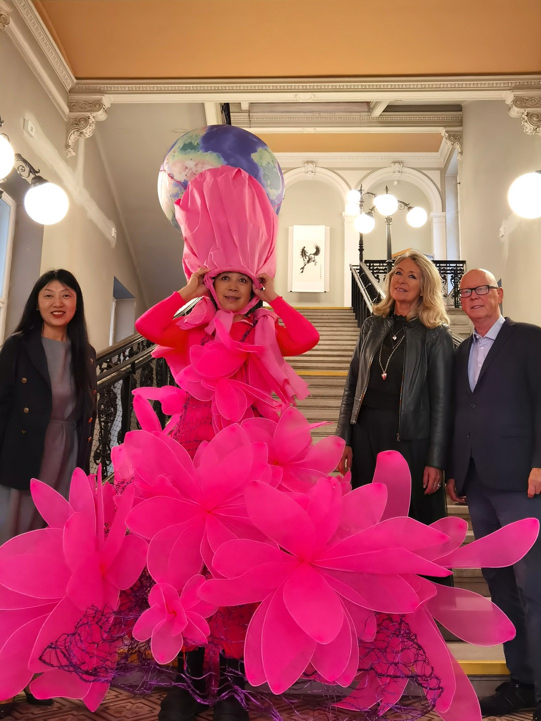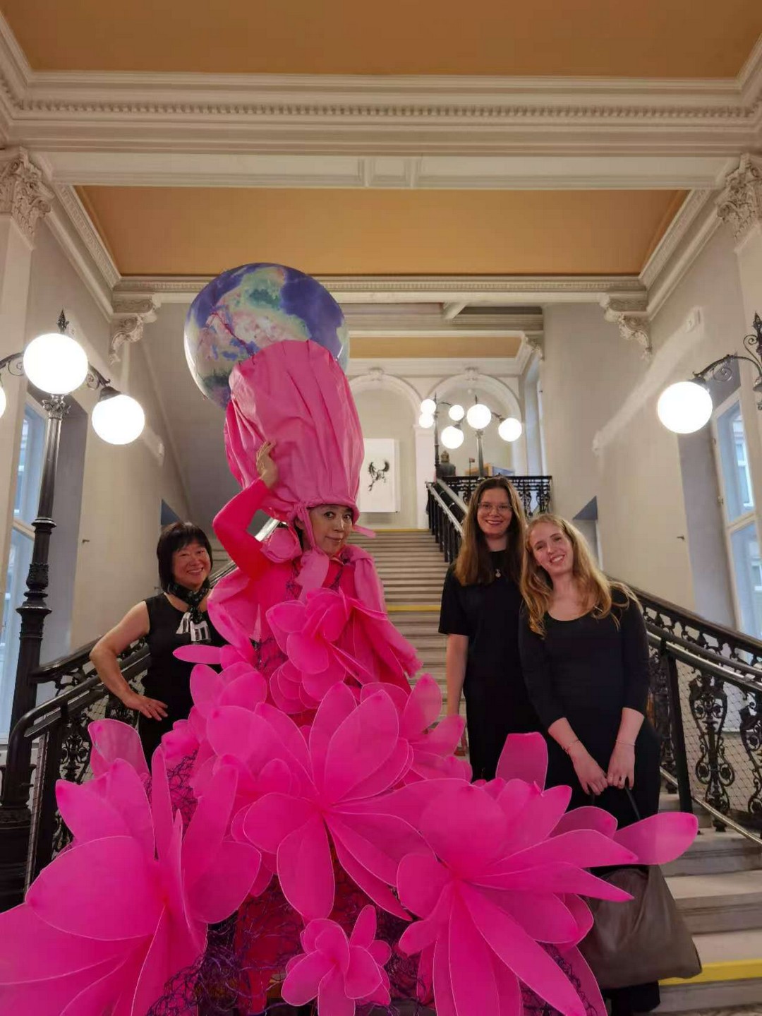活动现场,孔宁身着艳粉色荷花造型服饰,灵动身姿与作品主题深度融合。她在创作阐述中提到,粉色荷花象征纯粹无瑕的爱,希望这抹来自维也纳的“粉色诗意”能被地球感知,用跨越国界的艺术表达,让世界看见中国艺术家对地球的真挚关怀。