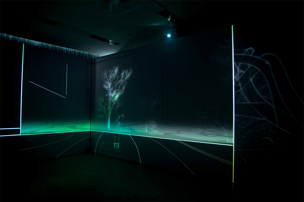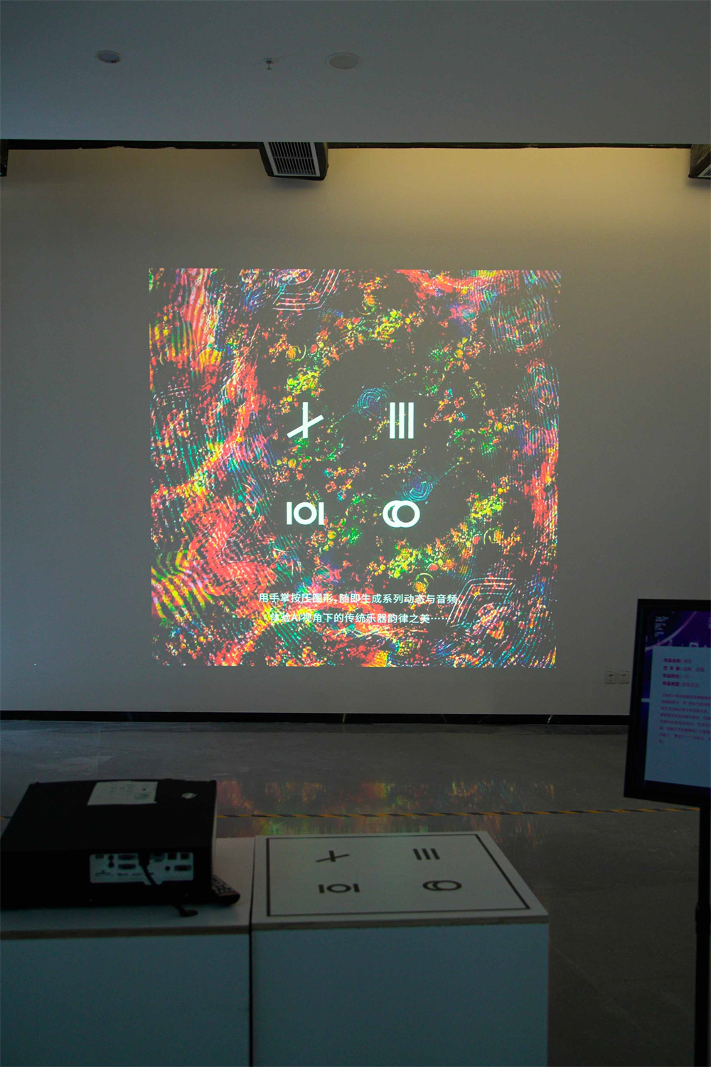 该单元戴砚亮作品是一项融合自然意象、中国禅宗意境与AIGC造物形象的虚拟沉浸式艺术项目,利用投影技术在现场构建出墨迹般呼吸的虚拟林境,虚实之间形成极具东方气韵的空间诗性。数智化呈现的树影似影非影、时空重构,回应着中国山水画中“可行、可望、可游、可居”的美学精神,也象征人工智能时代对“境”的再造与延展。作品以“沉浸式感知”替代传统观看经验,将现代数字技术转化为情境建构的媒介:观众仿佛步入一片数字森林,体验自然与科技的“共生”哲学。