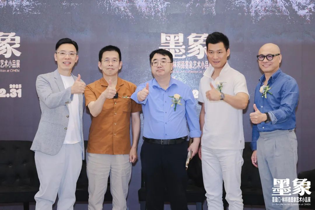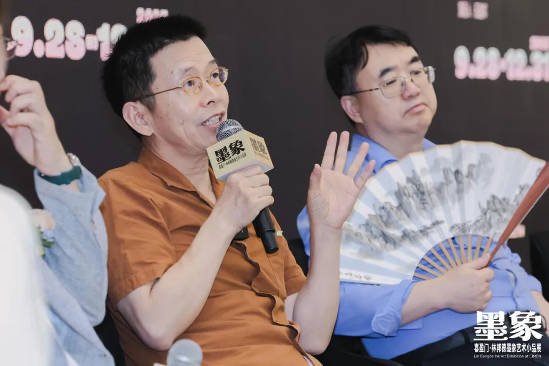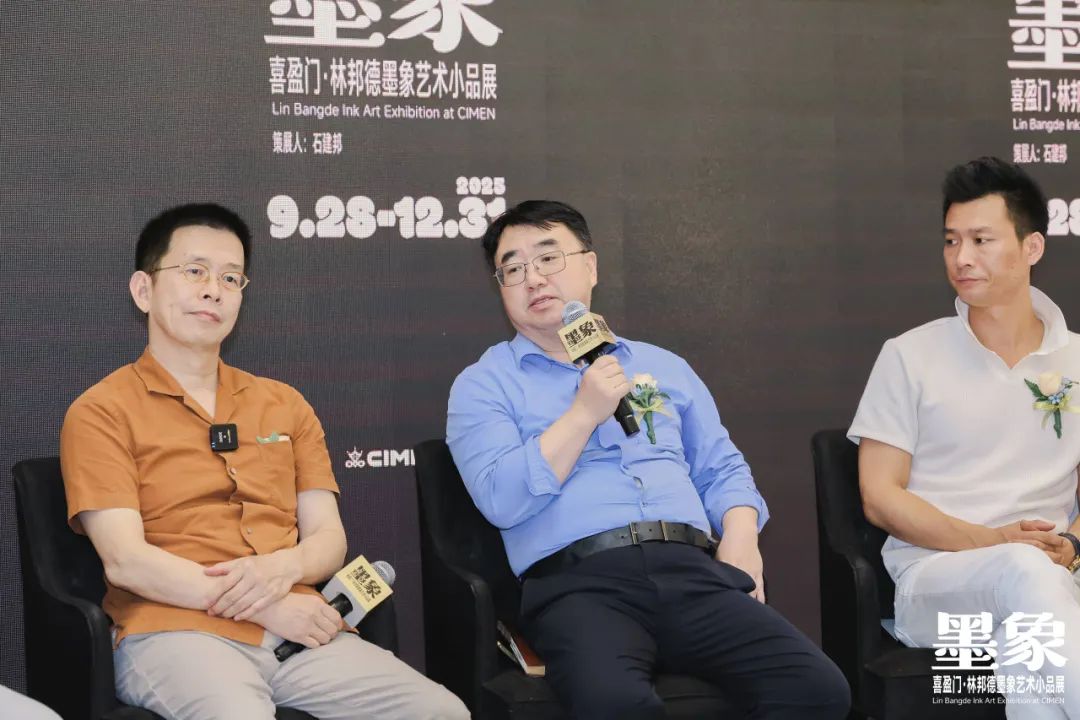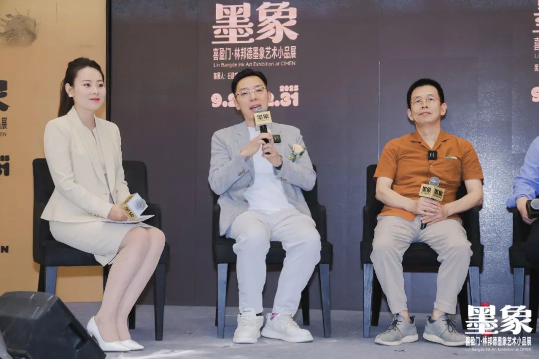 策展人石建邦先生则从学术角度进一步剖析了林邦德艺术的核心价值。他谈到:“林邦德的墨象艺术,并非对传统的简单背离,而是一种‘回归事物本身’后的高阶创造。其作品在解构汉字可读性的同时,强化了书写的时空节奏与笔墨的纯粹表现力,构建出充满东方哲思的‘空间意境’,这与现代建筑和室内空间追求的精神性不谋而合。”