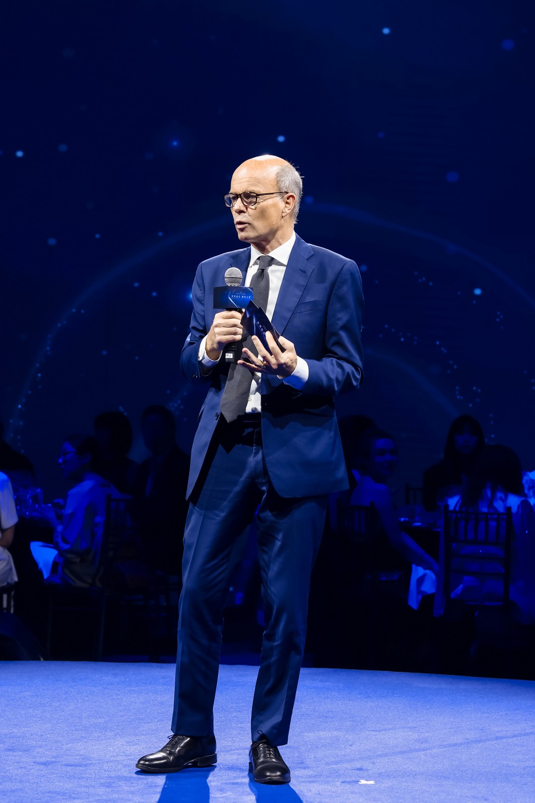 夜幕降临,星光熠熠。巡展结束后,“非凡之宴”主题晚宴于外滩老市府多功能楼开启。李菲儿、蒋依依、斓曦等十位明星踏上由“感应之门”“深蓝之道”构成的光影红毯,瞬间点燃现场热情。上海钻石交易所总裁林强先生和天然钻石协会首席执行官大卫·凯利(DAVID KELLIE)先生先后登台致辞,为这场融汇视听、味蕾与思想的盛宴拉开序幕。