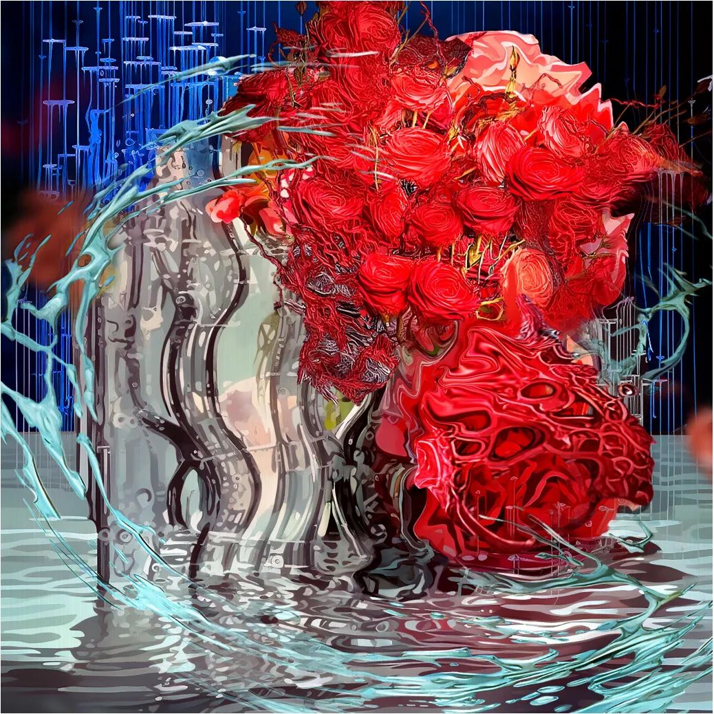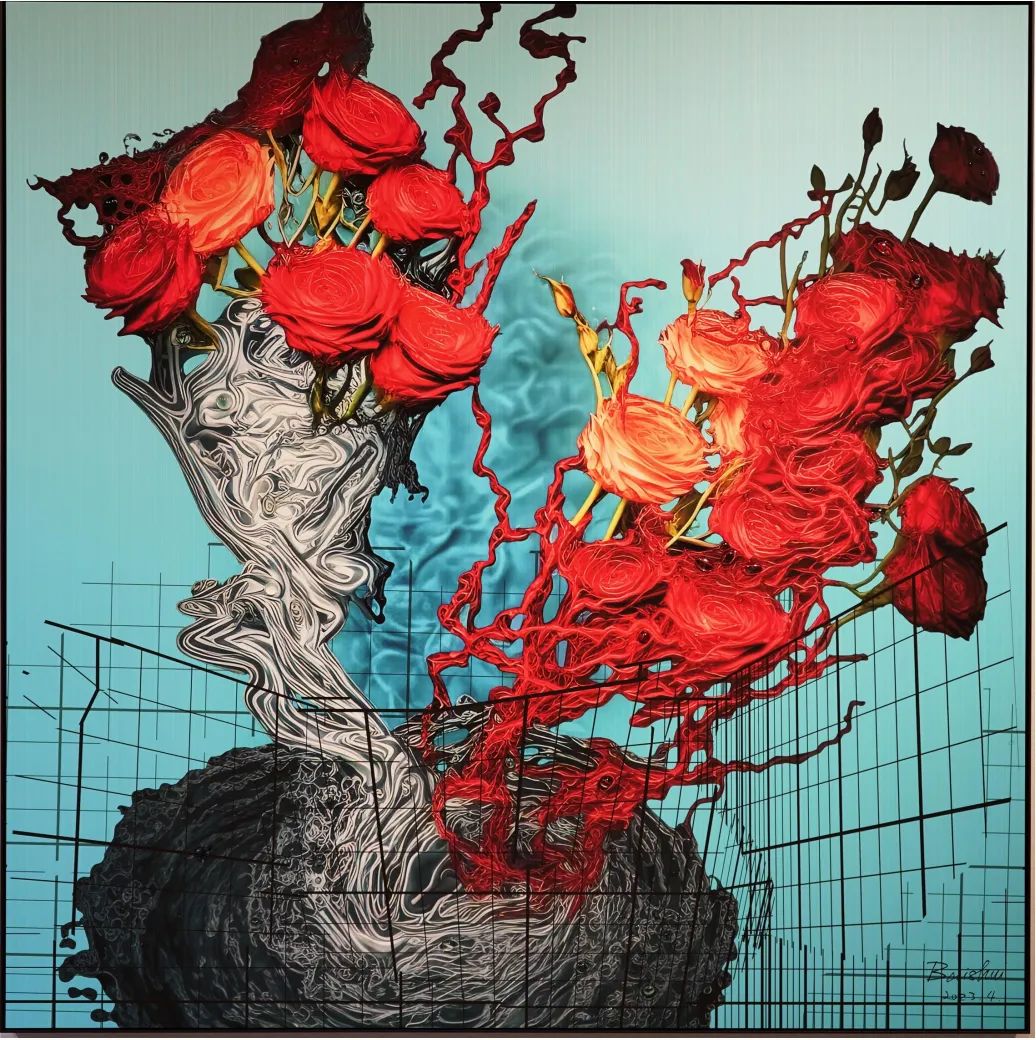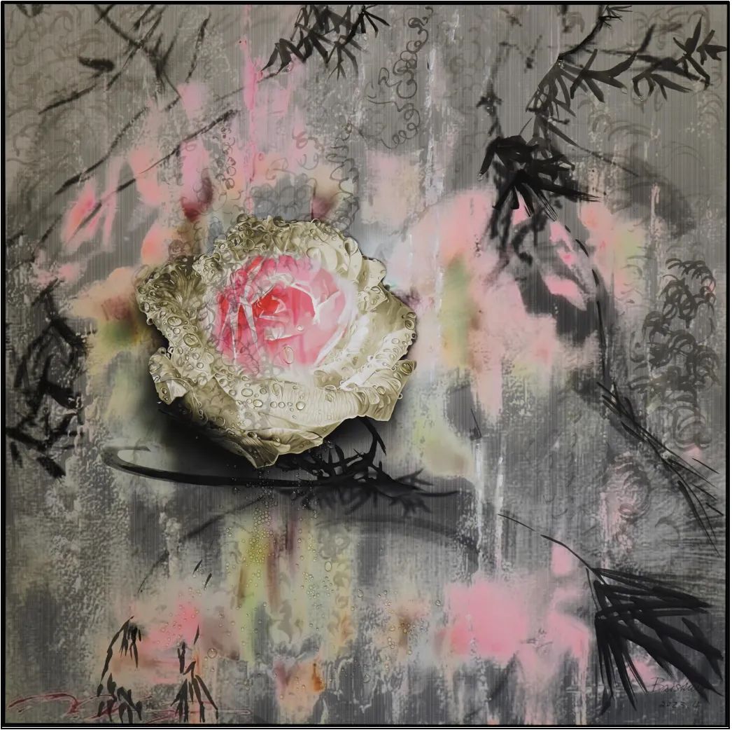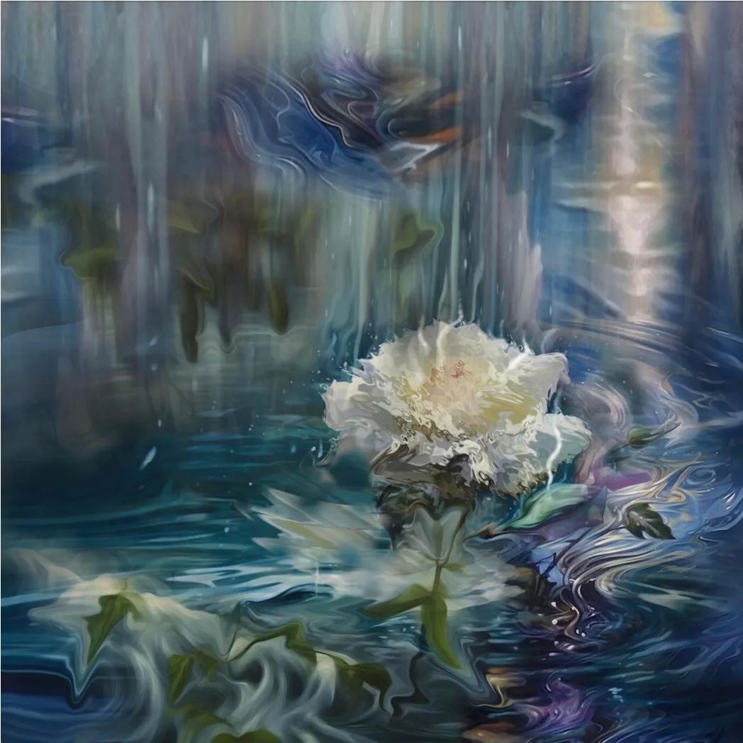 而另一条源流,则携带着西方艺术的严谨与当代的代码。她的艺术启蒙,并非氤氲的笔墨,而是西式素描所构建的理性与结构,这为她感性的东方内核,预设了一种冷静的观看之道。如今,她将AI算法视为这个时代毋庸置疑的“新笔墨”。这并非对传统的断裂或背叛,而是在吴冠中那句“笔墨等于零”的哲学密匙下,对“工具”的一次彻底祛魅——既然一切媒介终为表达服务,那么代码的逻辑与水墨的晕染,便可在本质上达成和解。
