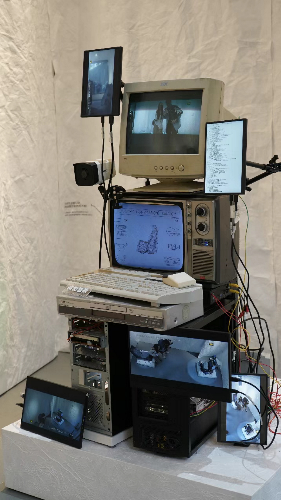 此次展出的作品包含数字影像、胶片摄影、装置、交互、CGi数字图像、生成艺术等多种类型,全方位展现了年轻一代艺术家对光与数字介质关系的多元探索。白宇的交互作品《星域·辉》邀请观众在宇宙之舞中与星辰邂逅,通过触碰引发流光变幻,在参与中感受碰撞的美学;梅卓和李伟庆的声音装置《原》让声音作用于水形成光影变幻,在听觉与视觉的跨界中勾勒生命无常;ProLab团队和彭耿坚的《Vision》装置作品从双缝干涉实验汲取灵感,以可见激光作为“意识的延伸”,探讨观察行为如何塑造光的本质,将量子世界的哲学思考带入视觉体验;W.I.P团队的《对话》通过粗粝的石椅和计算机堆叠而成的电子椅,构成跨时空凝视,探讨人类文明演进对物质实体材料性的影响,以及AI时代下物质性与社会实践的互动关系,以及人类在其中的存在关系;崔昱的《海螺》则将家乡的海声封存于装置之中,用数字技术守护着感性的记忆;郭康妮的《Mr Mucua》系列利用数字技术构建了一个后人类的地球图景,通过智人机“醋溜”的视角,探讨在“传统有机”人类缺席的时代展开开放性的思考;艺术家念子轩的《构像》从微观入手,用计算机的生成艺术勾勒粒子波动中蕴含的数学几何,展现世间波谱孕育万物。