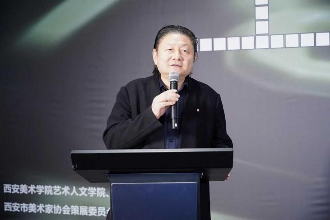 陕西省美术协会主席、西安美术学院院长朱尽晖作开幕致辞,他表示此次展览的主题“生成之间”意在促使我们深入思考当代中国的策展实践及其方法创新,面对新技术、新媒介、新机制、新环境,青年策展人需要创造性地回应和解决文化生产新变革、文化消费新需求及其带来的新问题。解构与重塑人工智能时代艺术家与策展人的对话语境,呈现中国青年策展人对当代社会和多元文化的审美观察与理性思考。现场展览呈现的作品形式多样,融合绘画、AI等,饱含对自然、生命、现实的深度思考与批判性,兼具学术意义与创新性,期待后续论坛能够碰撞出新思想,并预祝展览成功。