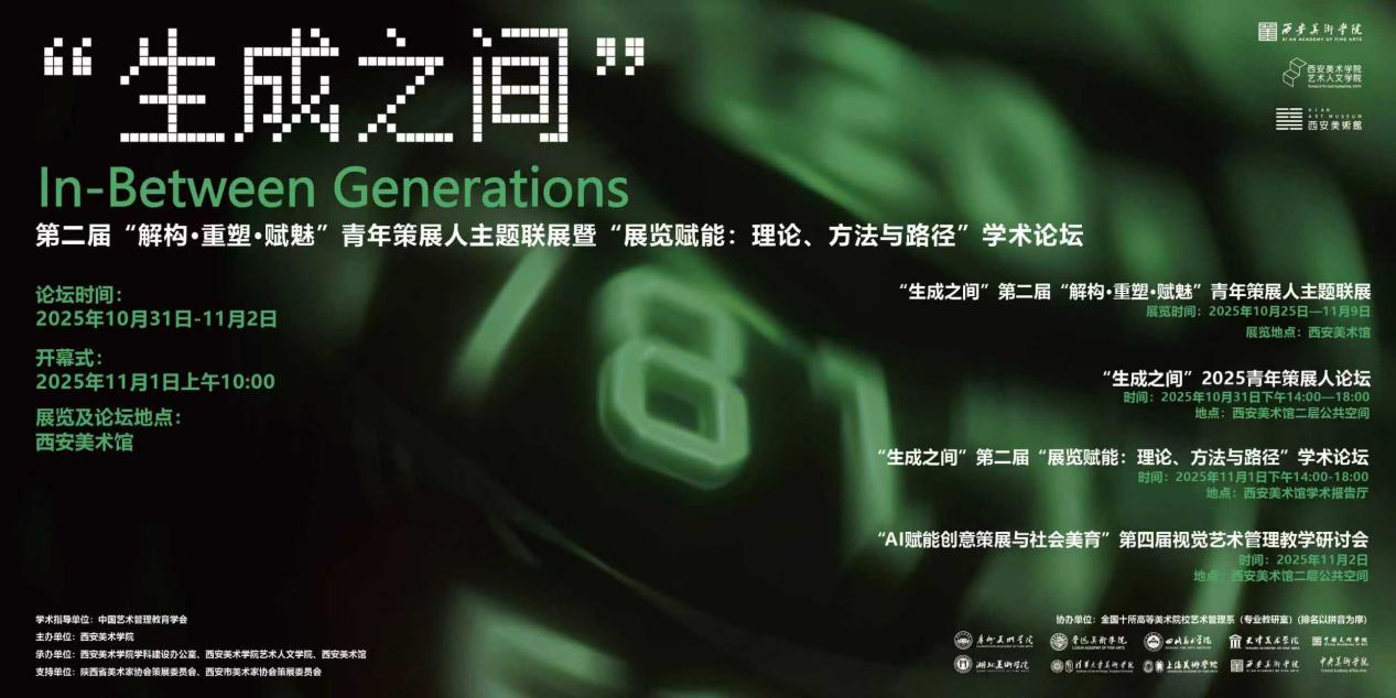 2025年11月1日,“生成之间”第二届“解构·重塑·赋魅”青年策展人主题联展暨“展览赋能:理论、方法与路径”学术论坛开幕式在西安美术馆一层大厅举行。本次活动由中国艺术管理教育学会担任学术指导、西安美术学院主办,西安美术学院学科建设办公室、艺术人文学院、西安美术馆承办,陕西省美术家协会策展委员会、西安市美术家协会策展委员会支持,全国十所高等美术院校艺术管理系协办。开幕式由西安美术学院艺术人文学院党总支书记、副院长周园主持。陕西省美协主席、西安美术学院院长朱尽晖、西安美术馆馆长杨超、西安市群艺馆馆长白利群、陕西省文化馆副馆长赵耀、陕西美协策委会秘书长、西安浐灞丝路美术馆执行馆长金冈;中央美术学院教授、批评家、策展人、博士生导师王春辰、广州美术学院艺术与人文学院副院长、副教授、硕士生导师吴杨波、上海大学美术馆馆长、上海大学上海美术学院教授、博士生导师马琳;西安美术学院教务处处长郭继峰、学工部部长、学生处处长胡亚兵、图书馆馆长李晰等校内外嘉宾出席开幕式。