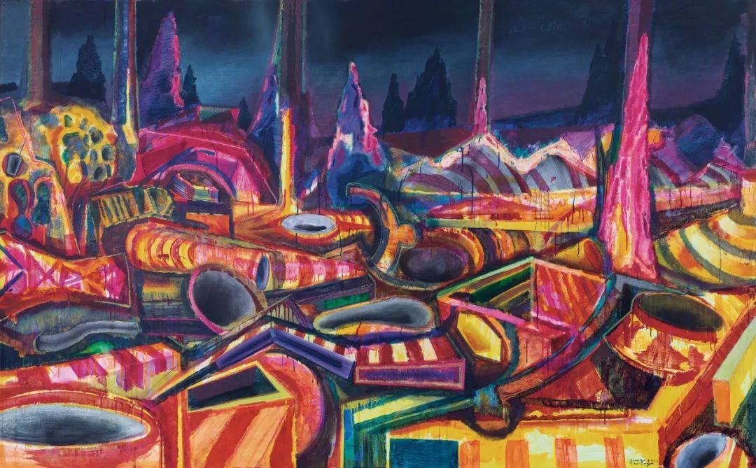2011-2012年间,黄宇兴创作了一系列充满未来主义建筑与空间元素的作品,几何切割感在《俱乐部》里体现得尤为直观。也正是在这一时期,艺术家经历了生命中的情感转折——挚爱之人的离去,在画布上化作一片片椭圆形的空白,如同消失的面孔,在绚烂而疏离的结构中,留下沉默而悲伤的叙事印迹。