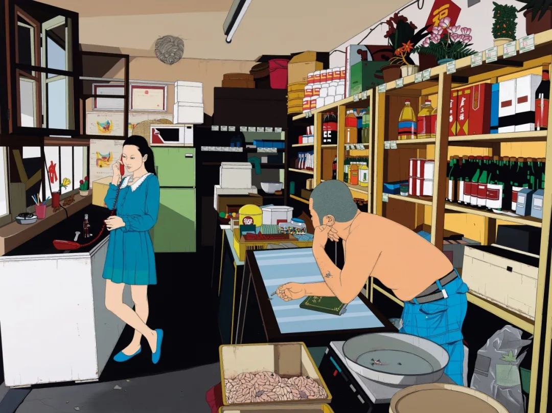 作于2012年的《马蜂》,曾作为其重要个展“来日方长”的核心。画面中,光着上身的杂货店店主正悄然打量着店内打电话的女子,这一充满戏剧张力的瞬间,瞬间将观者拉入一个未完待续的故事现场。
