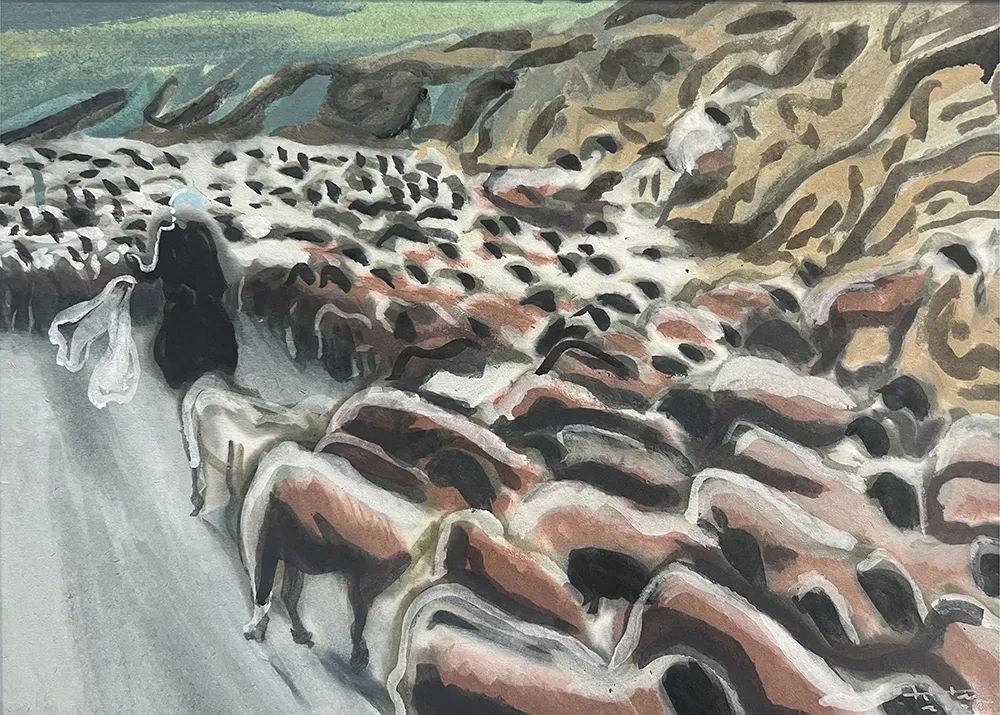 孙子垚打破传统水墨对“笔墨情趣”和“留白意境”的过分依赖,转向一种更具表现力与结构感的视觉构建。《那天日落》,他用粗犷、有力、时而重复叠加的笔触,构建枝干的遒劲。墨色在他笔下不再是“焦、浓、重、淡、清”的阶梯式变化,而是呈现出一种更为混沌的层次,和源自自然观察的、极具感性力量的色彩。那可能是浸染在羊背上的一抹暖赭,可能是春日田野中抽出的一线新绿。这些色彩并非平涂,而是与水墨相互冲撞、沉淀、融合,形成一种微妙而复杂的色墨交响。