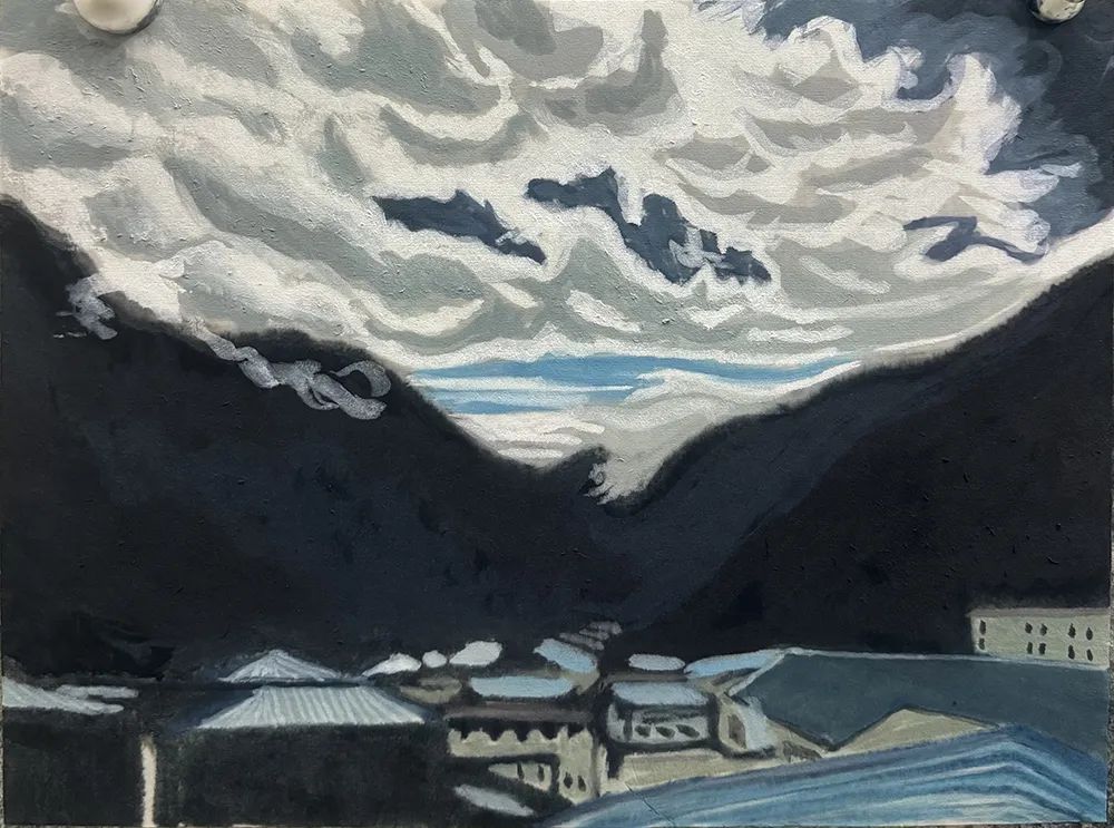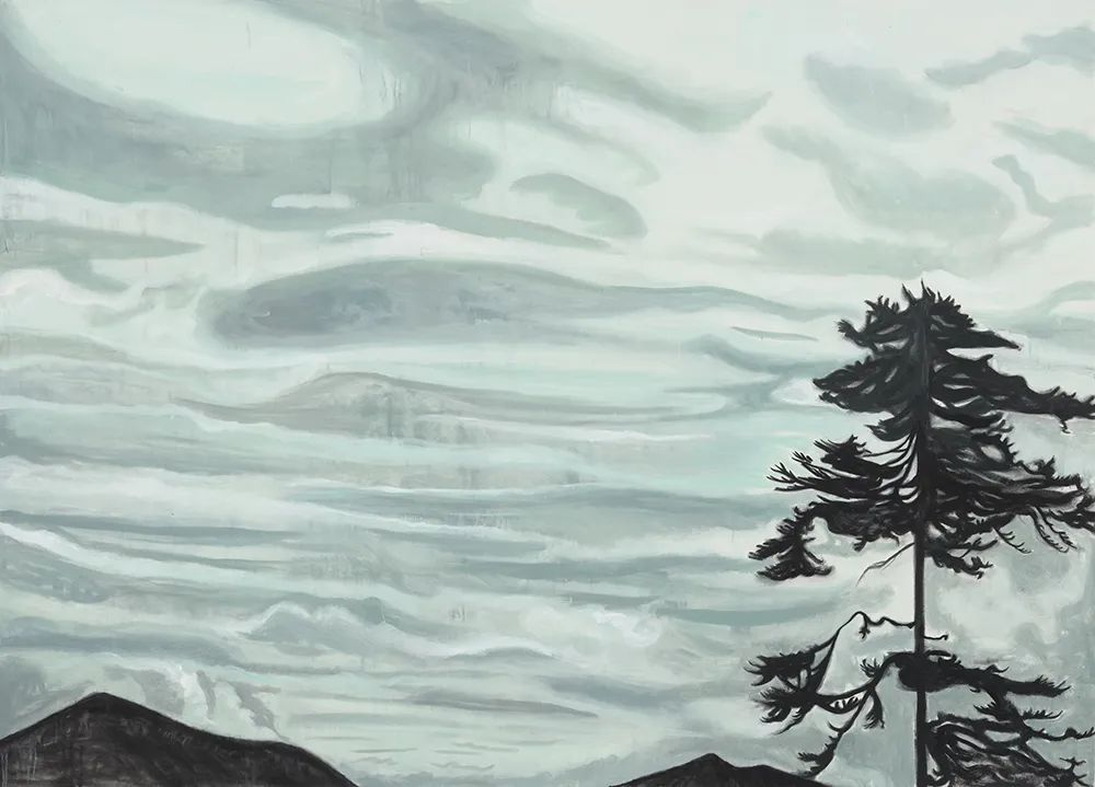 正是一种基于对大地极度的渴求,孙子垚从城市逃离,寻求向记忆深处的自然回归。当他的笔触落在画布上,描绘那一片《后山》的根系时,他调和的不仅是颜料,更是记忆中双脚踩过腐殖土时那柔软的触感,是汗水滑落脊背的咸涩,是松涛在耳畔的低语。画布上的《云海》,翻滚涌动的不只是白色与灰色,更是山巅清冷的空气灌入肺叶的凛冽,是身体与浩瀚自然相对时,那份渺小却切实存在的安宁。