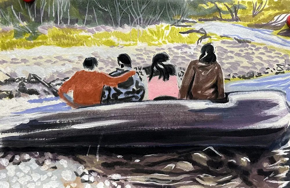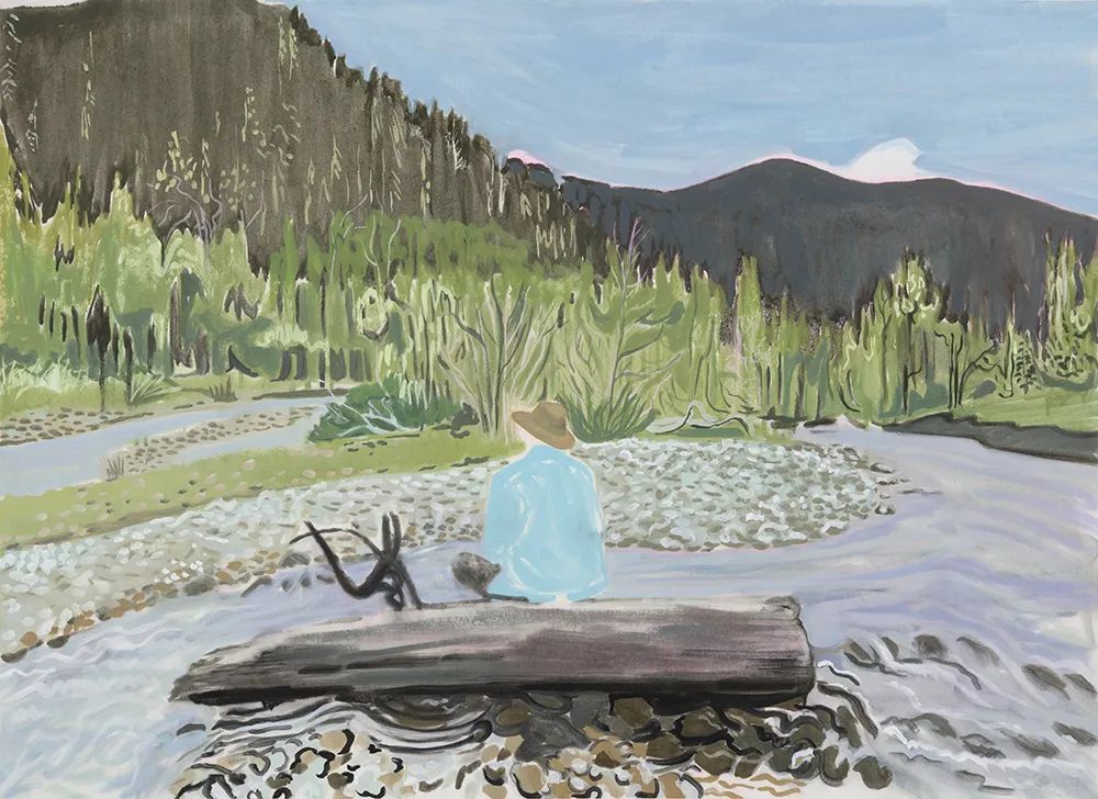 《农场义工》里,为逃离城市生活在做义工的女孩,正弯腰撷取各色野花。跃动的线条、水洗的矿物颜料,像是像素还没有经过升级的胶片电影,和着农场将时间重新调至缓慢。他的绘画,因此不再是简单的风景再现,而是一次次身体的复健,一次次将感官从数字世界的扁平与抽象中赎回,重新锚定于土地的厚重与温度。