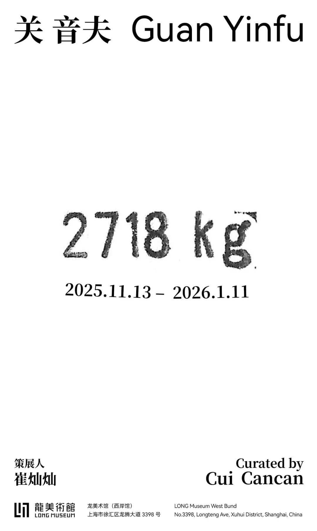 凯旋画廊艺术家关音夫将于2025年11月13日在龙美术馆(西岸馆)呈现其最新个展「2718 kg」。本次展览由崔灿灿担任策展人,展出关音夫近年创作的二十余件作品。