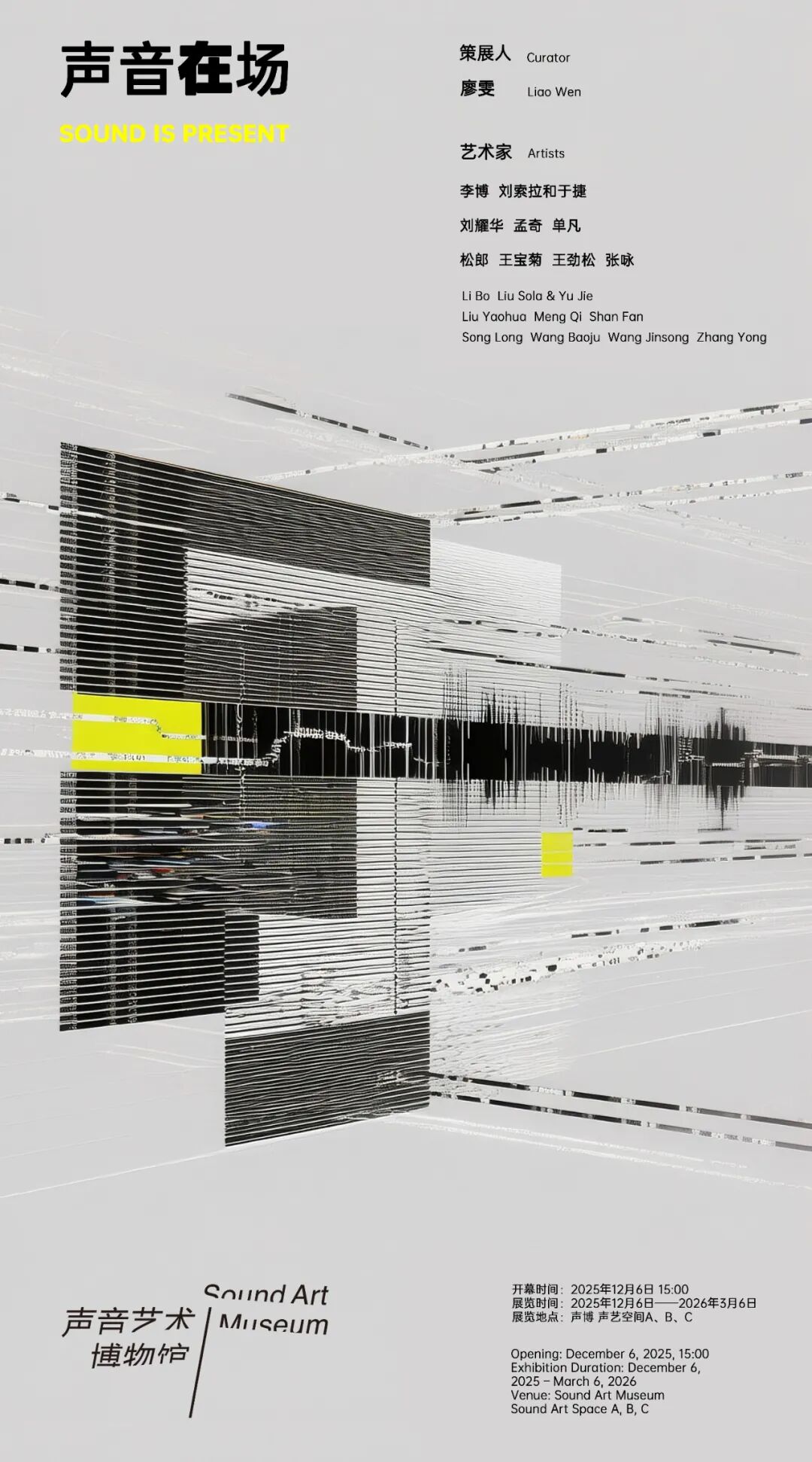 由著名评论家、策展人廖雯策划的《声音在场》展,将于2025年12月6日15:00在声音艺术博物馆声艺空间开幕,展览将持续到2026年3月6日。此次展览将展出李博、刘索拉&于捷、刘耀华、孟奇、单凡、松郎、王宝菊、王劲松、张咏9名/组艺术家的影像、声音装置相关作品。