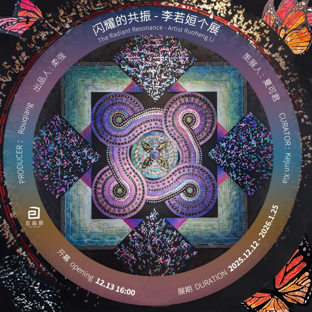 李若姮的绘画接续之前《城耀》系列的世界名城之夜色的珍珠闪耀,进入到中国与墨西哥从古老文明时期就已经开始的遥远相似的记忆与回照。面对时代的破碎与散乱的下降,在曼陀罗的坛城结构与量子态的波动消散之间,在幽灵的骷髅与幻化的蝴蝶之间,在女艺术家与圣母以及斗牛士的荣耀与死亡之间,都一直在面对那永恒的主题——即生与死的瞬间转化。萌发于西方亡灵节与斗牛场的现场感应,艺术家进入了方生方死与方死方生的持久思考。通过付诸形式语言的来回切换,把不同的维度与空间、回转的圆形与崩散的方形、凸凹不定的错觉与弧形纹理的咒语,以巨大振动的能量场聚集起来,体现出生死和文明之穿越和共振的艺术观念。绘画所展现的量子态带给我们一种能量场的新美学,把消散的力量以其明媚的闪烁,带着神圣的光耀,激发神秘与神奇的内在共振,让人文主义的理想得到了世界历史的精神反思。