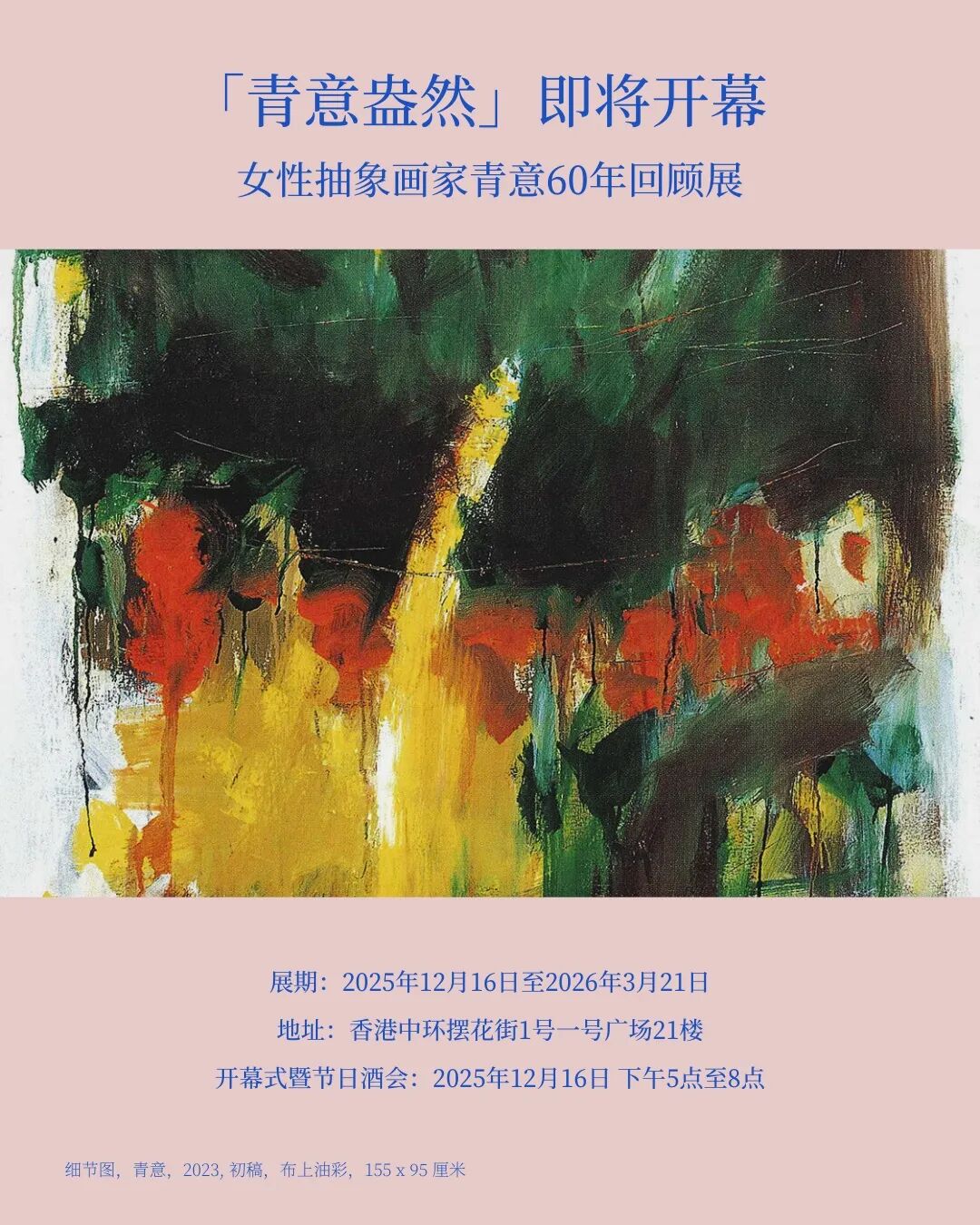 2025年12月16日,著名女性抽象画家青意的第六次个展《青意盎然:女性抽象画家青意60回顾展》将于艺倡画廊香港中环空间欣然开幕。该展览标志着艺术家于2023年辞世后在香港举办的首次个展,展出11件张油画和11件精选的纸上作品,包括水彩和拼贴。