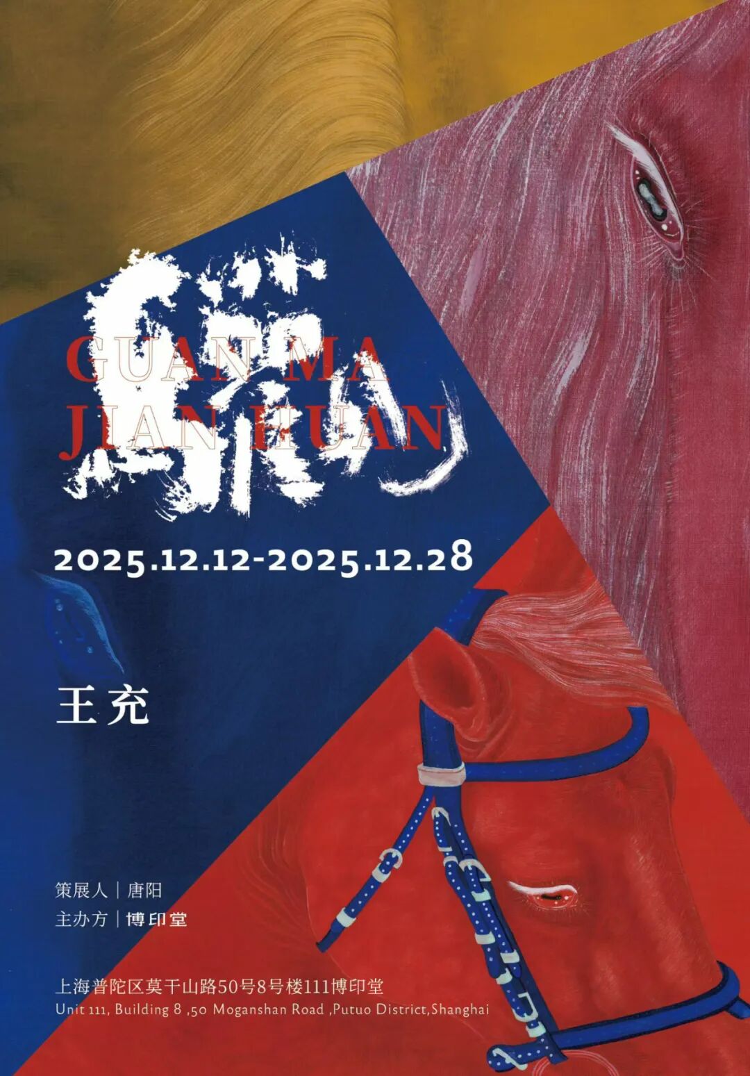 由此,谈到我本次展览的主题——观。五六月份,我在苏州已经以“意马心猿”为主题做了个展览。此次展前,我问策展人,我的好友唐阳兄,这次用什么展名?他想了想,又问我的意思,我说,就用心经开篇的观自在的“观”怎么样!观,说文解字释为谛视,意指仔细的看、审视,强调有目的性的观察行为,起源可追溯到甲骨文时期,早期字形源于雚(猫头鹰),如猛禽俯视大地的形状。象征高瞻远瞩、锐利洞察的视角,引申为景象和对事物形成的看法、观点、观念。即“观形貌”,又“观性情”,不论对于创作者还是观赏者来说。观,即是方法,也是媒介,这很适合我现阶段的心境。他说很好。又谈到请谁题写展名,是请老前辈还是写的好玩儿的同辈人,我们都知道这个写的好玩的同辈人是谁,于是大晚上就去了“海上叔重画室”(吴子建老师题写,当晚他说要刻成匾),请叔重兄题写展名。碰巧上博的施远老师也在,谈及这次展品以马为主,于是建议仍以“观”为展名,书作“馬雚见”,可解读为“观(觀)马/见欢(驩)”,大家都觉得极好。 本次作品展与两年前在海上的作品展面貌大相迳庭,或许会给一些朋友带来不一样的感受和讶异,是以草小文以记。