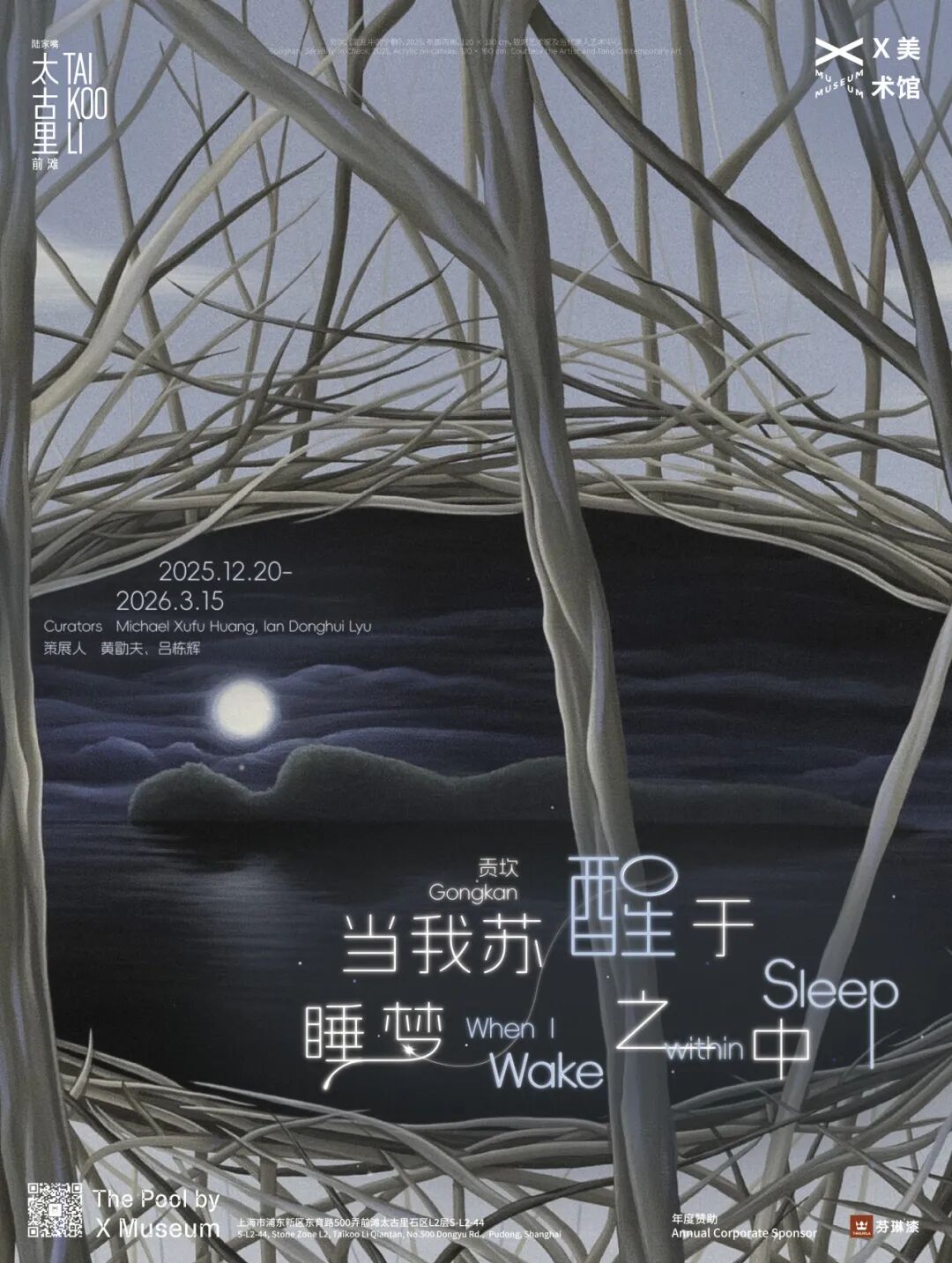 本次展览呈现贡坎于近年创作的十二件作品,包含十件绘画作品,一件雕塑和一件由X美术馆特别委任的场域特定装置作品。展览标题“当我苏醒于睡梦之中”将“苏醒”与“睡梦”并置于同一个语义空间,通过捕捉介于意识与潜意识之间的瞬间、模糊且难以被界定的个体状态,探讨个体身份在绝对二元关系中的复杂境况。在弗洛伊德的心灵结构里,自我总是游移于本我与超我的界限之间,试图在欲望与规训的冲突中寻找一个临时而脆弱的平衡,使人得以窥见内在深处的真实动势。