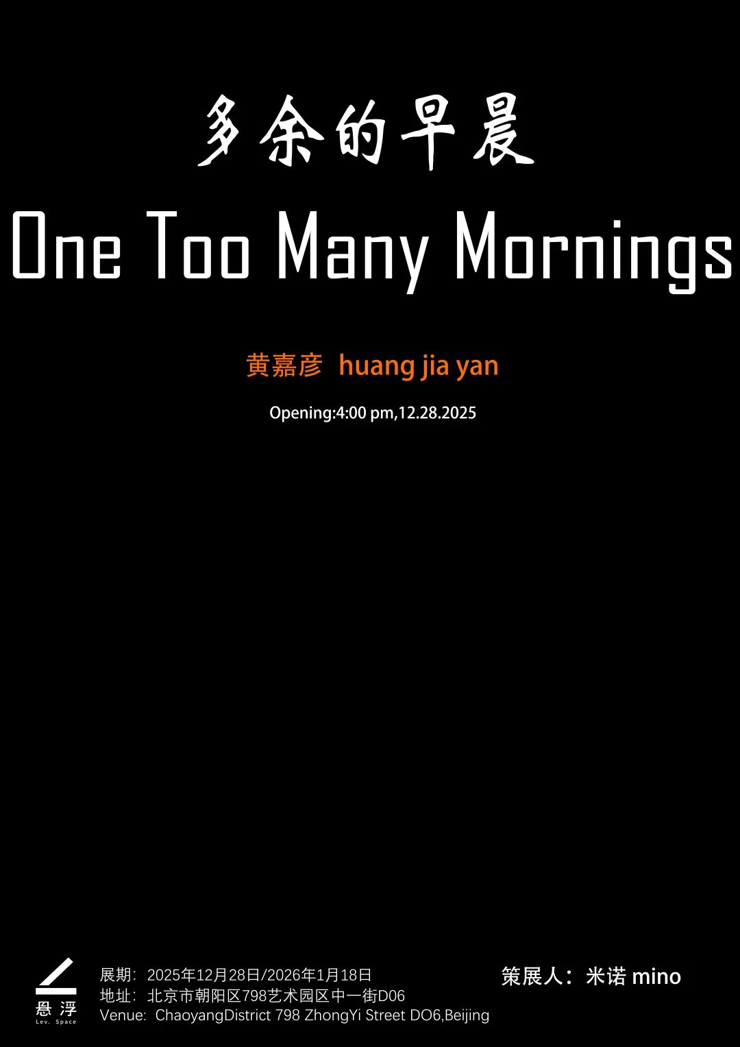 悬浮空间即将展出由米诺策划的黄嘉彦个展《多余的早晨》,展期为2025年12月28日至2026年1月18日。展览主要聚焦艺术家黄嘉彦近十年部分重要作品,在不同创作时期的五个系列:“形状史”、“不舍昼夜”、“做什么都保佑你”、“多余的早晨”、“深色黎明”,涵盖绘画、雕塑、装置、摄影、拓印,影像等多种媒介,在这些作品之间隐现艺术家的观念与工作方法。
