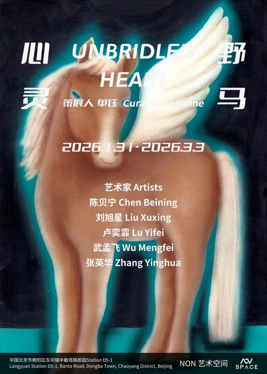 NON 艺术空间将于2026年1月31日至2026年3月3日荣幸呈现群展《心灵野马》。作为NON 艺术空间的开年首展,将呈现以“马”为意象主题的特别展览,囊括了陈贝宁、刘旭星、卢奕霏、武孟飞、张英华等五位青年艺术家近期新作。