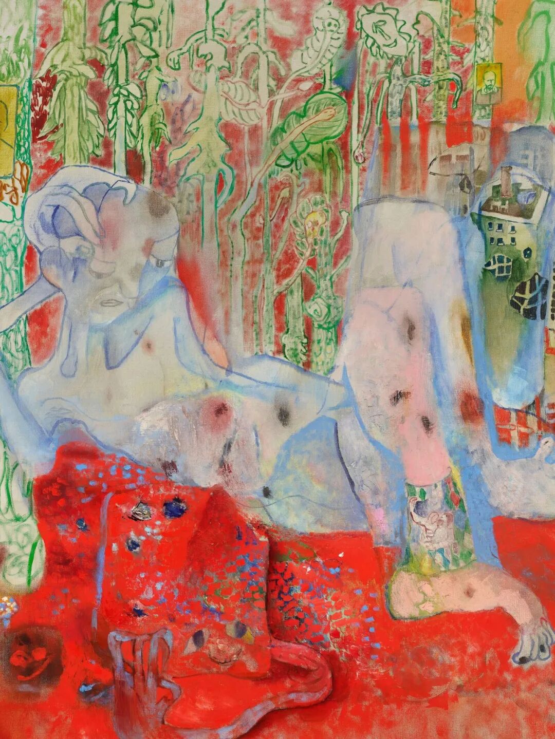 仇晓飞故乡的自然元素、建筑景观、亲人形象以及奇异人形角色彼此纠缠,在多幅油画及纸上作品中形成梦幻图像。花朵及凋零的花瓣在众多作品中反复可见,提示了这一事实:生态更新是死亡的自然结果,而遗失则催发了生长。在展厅后方展示的四件大尺幅画作依托四季情景探索了万物变幻、情感演变的永恒叙事,将自然世界的周而复始与人类生命经验的循环往复相联系。