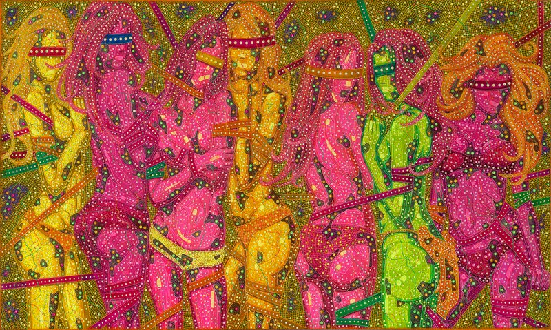 在金德峰的作品中,那些不经混色、以纯度取胜的绚丽原色,显然受到了传统年画的影响。然而同样重要的是,与原色同样醒目的荧光色与霓虹招牌般的光效,亦可被理解为他从厦门城市文化中获得的刺激——厦门既是中国“开放改革”的象征之一,也是一座在资本扩张之下被璀璨人工光所充满的都市。金德峰所目睹的当代美学,是一幅繁荣的金色与消逝的黑暗并置共存的二元景观。他并未止步于对这一挥发性景象的再现,而是创造出一种画面:华丽的装饰性与孤寂、空无的深渊以悖论的方式同处其间。他将从厦门霓虹中捕捉到的、明灭幻影所激起的瞬时孤独与不安,编织进如同“经络”一般的线条体系之中,于是画面化作一张生命地图;在其上,生成与消逝循环往复。那无数线条既是生命的网,也是对华丽都市内部所潜伏的疏离创伤进行修复的艺术针灸。