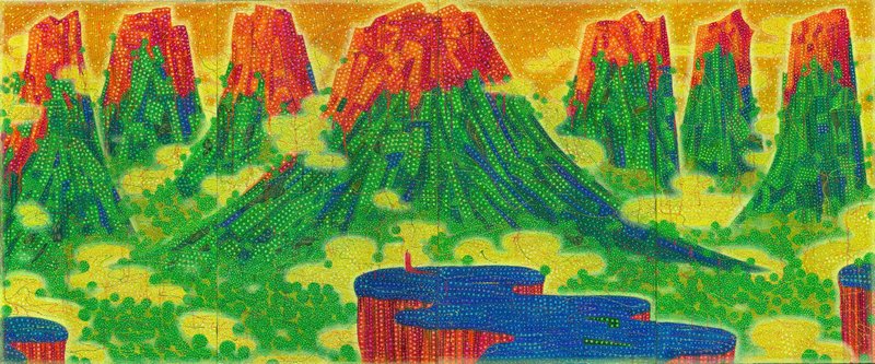 同题材的《当凝望成为剧本》中,隆起山峰的强烈橙与红,与之构成戏剧性对照的绿色山脉,逼仄而饱满地占据巨幅画面。中央一位身着传统服饰的人物立于青色峭壁之上,似在观照这宏阔自然,这一设定令观者联想到“大景”山水人物的经典图式。然而此处的“山水”与其说是现实自然的摹写,不如说更接近一种内在风景:它像是被强烈情绪压缩后的幻影。作品与传统山水的关系并不在笔墨谱系,而只在构图的借用。尽管画面色泽华丽、如玻璃珠般透明的圆形元素营造出神秘氛围,但其中仍弥漫着一种难以消散的“寂寥”,因为这并非我们立足其上的真实世界,而是一处被隔离出来的、梦幻而封闭的空间。
