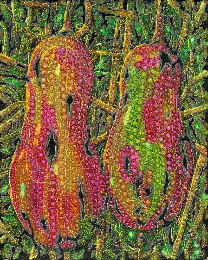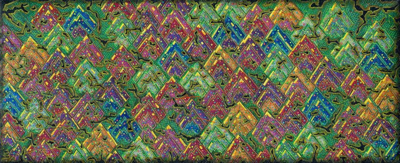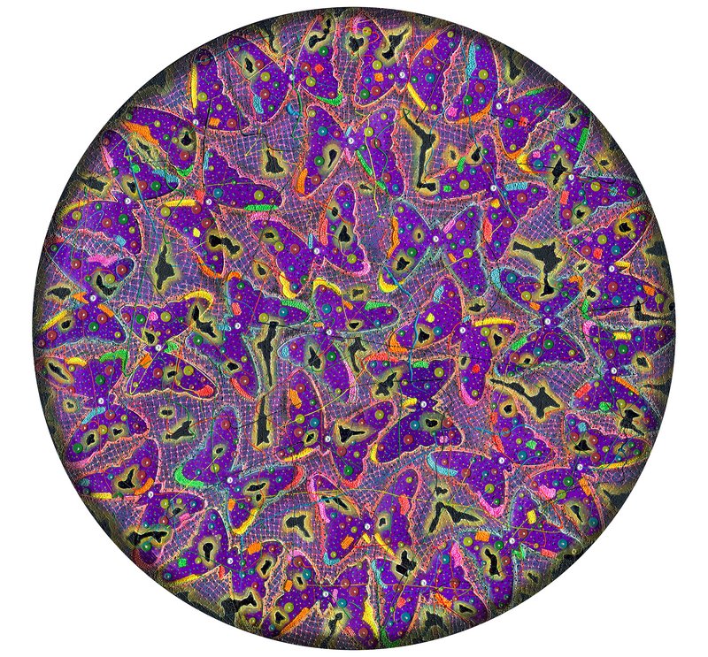 当他下定决心“打破绘画”时,他不仅关注苏绣与景泰蓝等中国传统工艺中精密的掐丝金线工艺,也将目光投向传统年画鲜艳夺目的原色体系。为了锻造属于自己的独特技法,他借由二方连续与四方连续的构成美学,发明出一种“毁灭重生”的方法。其路径是:先借助版画技法在画面中建立阴阳结构,再以密集点描,使画面呈现为由无数细胞组成的生命体。于他的画面之中,线条如同中医学所言气血运行的通道——经络一般,承担着为画面注入生命力的角色,仿佛毛细血管在其中延展与搏动。要有效观看这些作品,需要三种视点的递进。首先是远观:与作品保持一定距离,观察其表层图像、独特的光色效果,以及材料与技法生成的整体视觉特征。继而进入中观:材料与肌理效果开始与表层图像相互缠绕,触发视觉与意义之间的冲突,使观者不得不重新思考——因图像变化而产生的意义叠加与扭曲。最后抵达近观:当我们贴近画面观看时,表层图像逐渐退场,材料与肌理则以中观阶段所引发的视觉破坏与意义变形为基础,完成一次视觉的再生与意义的重构。