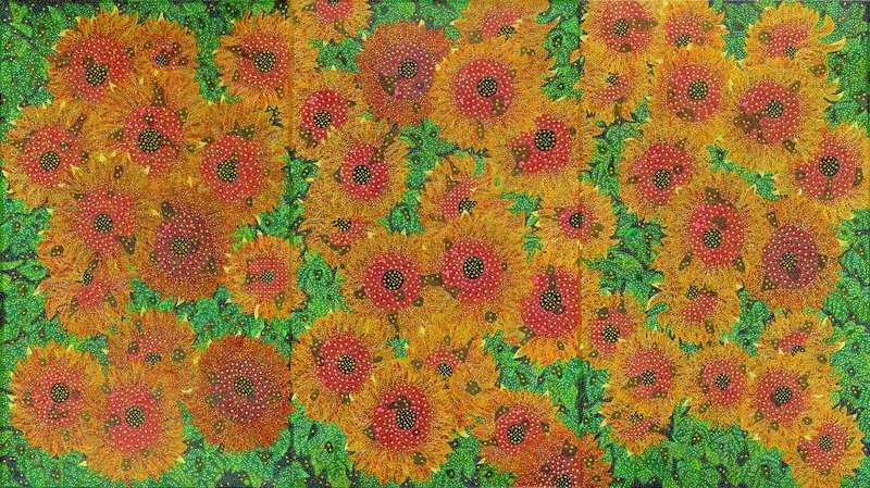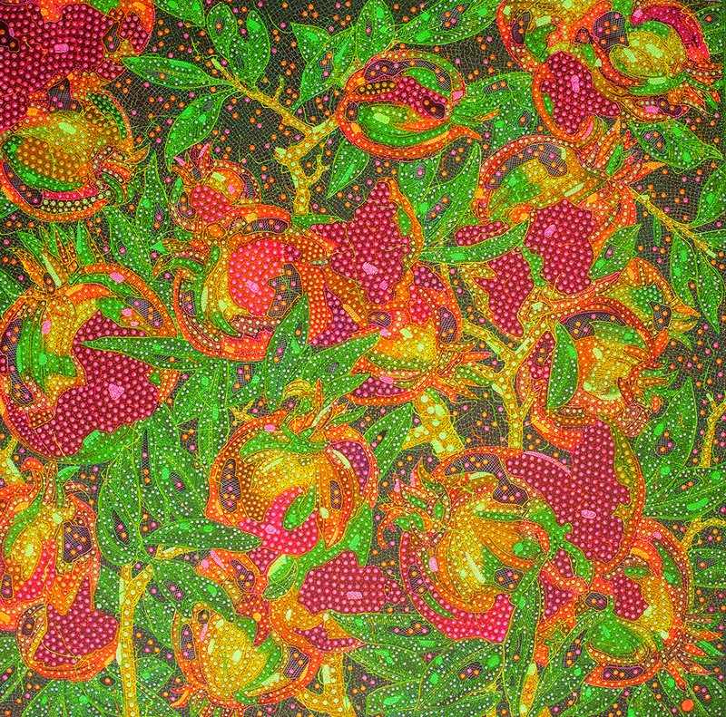 要理解他为何如此执着于“打破”,有必要围绕三组系列的代表作加以辨析。先看“破壳”系列的《破壳——万仟菩提》:红色系的花瓣与由圆形构成的绿色形态几乎充满全幅。然而花瓣之红亦由无数圆点与细小色点织就,在补色对撞的视觉刺激中,整幅画面仿佛被推向一场炫目而繁盛的光色祭典。甚至花瓣与绿色圆盘之间那片浓重的暗部,也由密集的色点构成;空间深度与透视在此被消解,画面被彻底压平为一种均质的平面。尽管他投入惊人的工力——不仅逐点经营,连决定形体轮廓的线条也细致推敲——最终的呈现却异常“数字化”。但与数字工序所带来的干燥结果不同,他的画面是近乎修行般的执拗劳动所生成,因此仍带有生命的气息。作品乍看像是对花朵的近距离描绘,却因其不愿遗漏任何一个“细胞”的偏执,工艺性的精确与装饰性的繁复反倒意外地导向一种超现实景观。花瓣中心被反复嵌入的“眼”,令人想到佛画中佛与菩萨的目光:它牵引观者被吸入华丽的表面深处;换一个角度,它也迫使人意识到——在那凝视之中,我们的存在仿佛被照见、被暴露。花的装饰性之美背后潜伏着无数“凝视”,它既制造诡异的紧张,也指向存在的根源性孤寂与认知的无限延展。