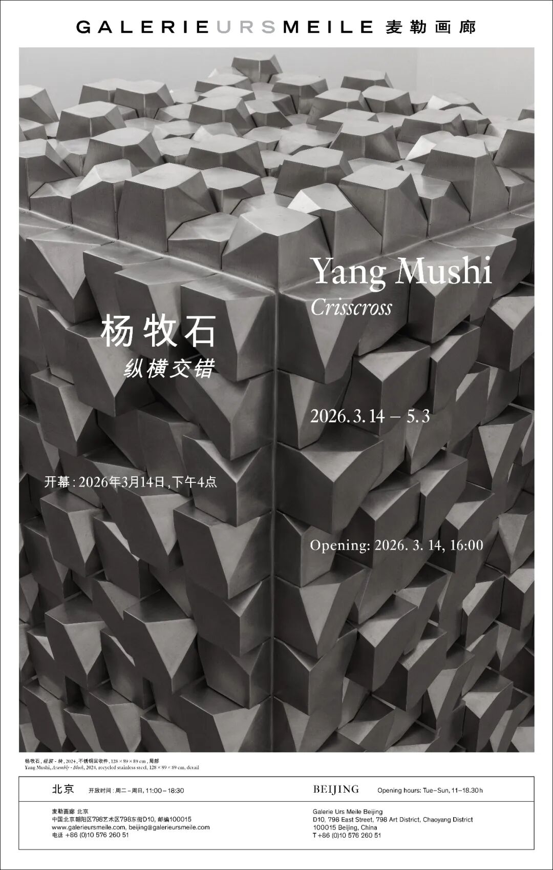 麦勒画廊荣幸地宣布举办艺术家杨牧石(生于1989年)的个展“纵横交错”。本次展览中,杨牧石通过严格焊接的结构、棱角分明的几何形体,以及在高度系统化秩序内精心排布的微妙差异的碎片化组件,对画廊的白盒子空间进行割裂。展览标题指向艺术家独特的工作方法,即将分离的金属部件纵横交错地焊接并固结为统一的雕塑实体。众多碎片在结构上整合成既锋利、具有侵略性又引人沉思的形态,在受规约的系统内被刻意错位安置,引入了细微的矛盾,反映了个体在面对社会审慎又充满限制的外部框架时所体验到的张力。