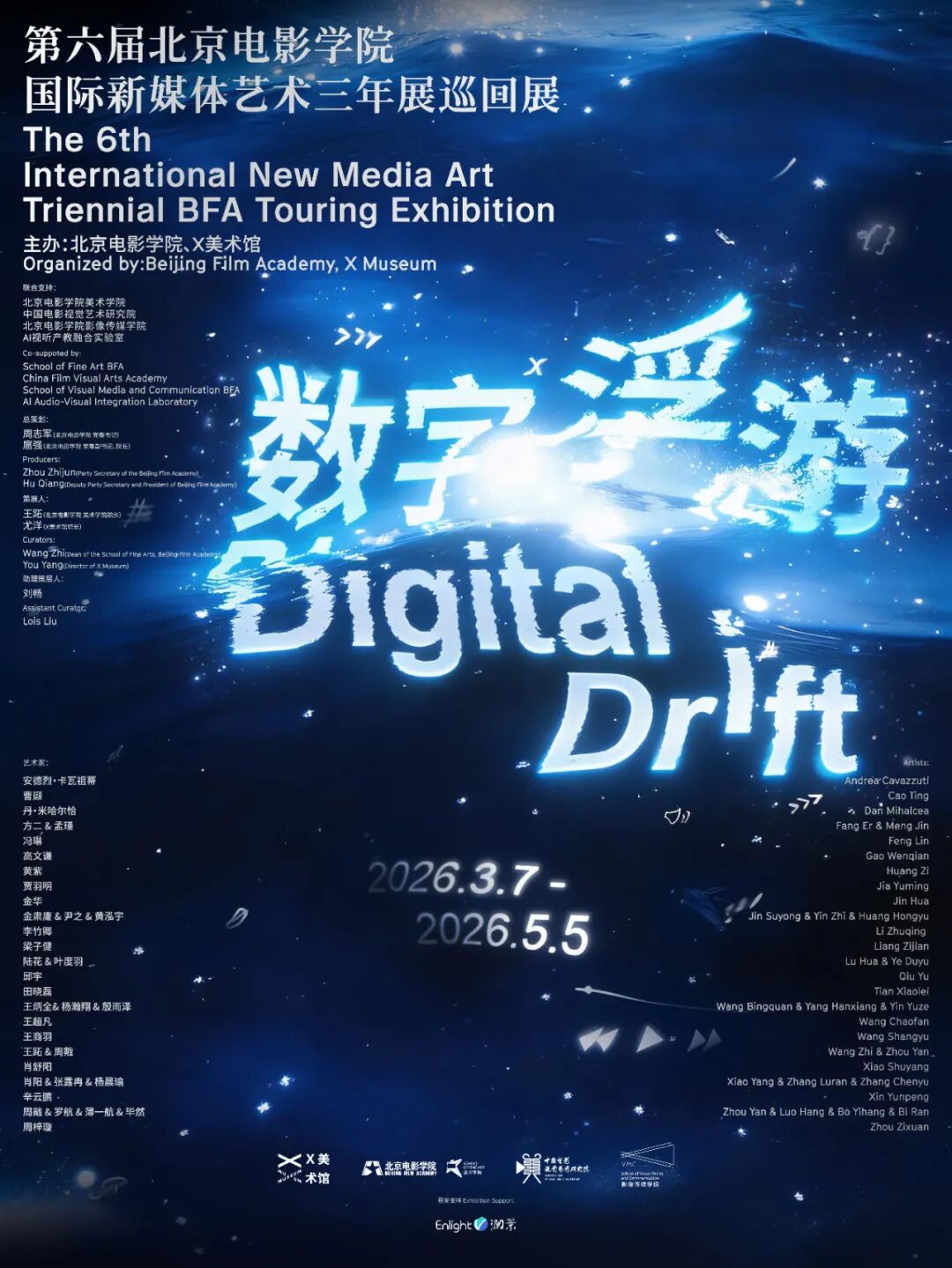 2026年3月7日至2026年5月5日,X美术馆联合北京电影学院,于美术馆二层空间举办群展“数字浮游——第六届北京电影学院国际新媒体艺术三年展巡回展”。作为与北京电影学院联合呈现的新媒体艺术项目,此次巡回展延续了该国际性艺术交流平台自2008年创办以来探索艺术与前沿技术深度融合的脉络。作为持续关注数字艺术与多元媒介实践的当代艺术机构,X美术馆始终致力于通过物质与非物质文化的收藏和阐释促进观众的分享和交流。第六届展览立足于当下中国新媒体艺术教育所处的文化与科技交汇前线,既关注教育体系内部如何积极推动艺术观念与技术语言的融合,亦追踪学院创作者在这一过程中的多元实践,以此开启对数字时代创作机制的持续探问。
