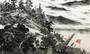 这幅《转战》以水墨写意,再现1934年红军告别苏区、夜渡于都河的壮阔场景。