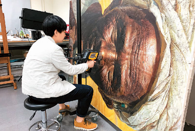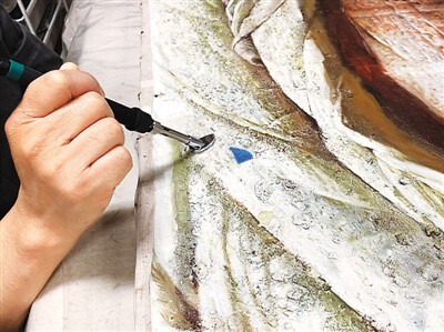 对油画《父亲》做局部加固颜料层