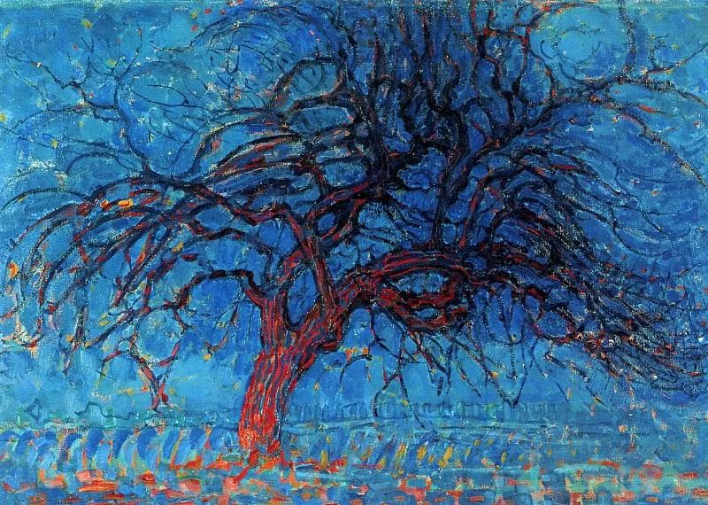 蒙德里安早年生活在封闭的荷兰小城阿姆尔弗特,没有受到现代艺术的熏陶,因此其风格仍然是写实的和再现性的。1911年,蒙德里安在巴黎看到了毕加索和布拉克的立体主义作品,受到了强烈的震撼,从此开始了对于抽象艺术的追求。如果我们把他此后数年间创作的《红树》《灰树》《开花的苹果树》加以比较,就能够清楚地看出其风格的演变过程。第一幅画创作于1908—1910年,尽管画面上的色彩不再具有写实性,但对树干和树枝的刻画仍有较强的具象性,大体上保留了树的自然形态;第二幅画创作于1911年,立体主义的影响已经十分明显,因为树的主干和枝条都已经逐渐趋近于标准的几何图形和线条;第三幅画创作于1912年,在抽象性上已经逐渐超出了立体主义,因为树的形状基本上已经无法辨认了,画面上只剩下标准的弧线和直线,以及浅绿、浅黄的色彩块面。