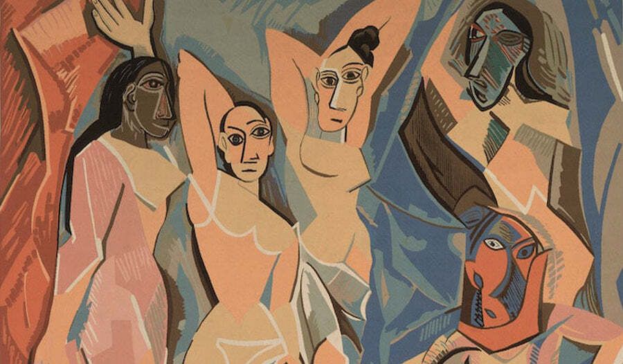 后期印象派绘画对于图式和观念的重建不可避免地使现代绘画走上了抽象化的发展道路,因为现代画家不愿意把图式和观念隐藏在影像背后,否则他们就会重新走上近代绘画的老路。因此,他们不断地削弱影像的感性特征,使图式越发清晰而独立地呈现出来,最终以图式取代了影像。尽管塞尚为了凸显几何图形而有意识地改变了人体和景物的形态,但他仍较为完整地保留了影像的感性特征。立体主义则不同,他们尽管把塞尚奉为自己的先驱,但却不再把影像与图式的同一奉为圭臬,而是不断地用图式来改造影像,使得影像的感性特征受到了实质性的伤害。在立体主义的开山之作《亚威农少女》中,毕加索把少女的乳房描绘成标准的圆锥体和球状体,有的甚至被画成了四方体。
