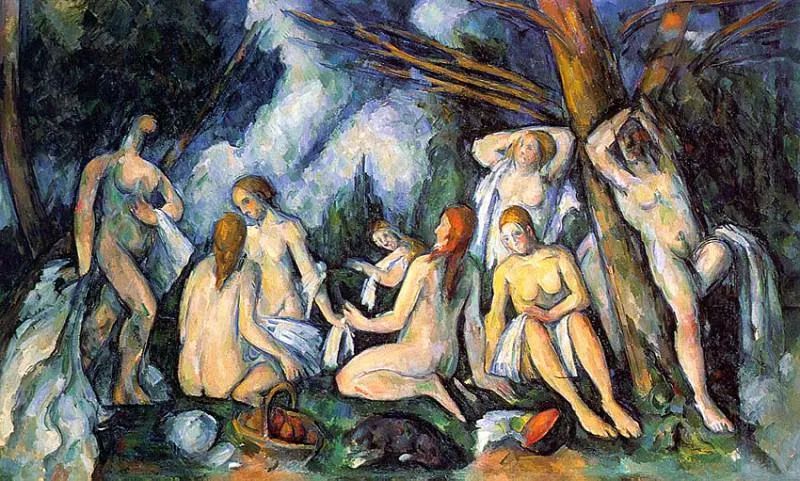 对于透视法的重建其实也就是对于图式的重建,因为图式的重要形态就是同类事物的几何结构。我们前面曾经指出,康德把图式划分为经验性的和先验性的,其中经验性图式是对经验性概念的直接演示,而经验性概念所描述的就是同类经验对象的共同特征,因此其图式也呈现为一种经过简化的抽象图形,比如狗的图式就是一种四足动物的形象。不难看出,塞尚所说的圆柱体、球状体、圆锥体恰恰是人体以及自然景观的基本图式,比如塞尚的名作《大浴女》就把浴女的手臂和画面两侧的树干刻画成近乎标准的圆柱体,而向内倾斜的树干又构成了一个圆锥体,从而支撑起画面的构图,使得画作既保留了鲜艳而绚丽的色彩,又获得了坚实的结构。
