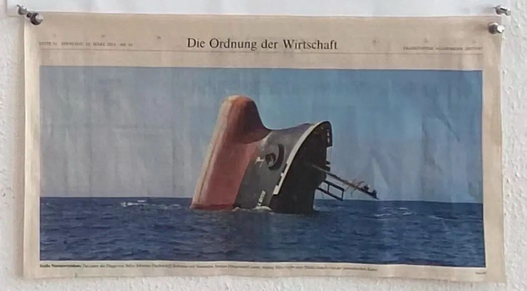 艺术家还通过绘画与近期的全球事件形成对话,如在名为“鲁比马尔号”的系列画作中,主题是2024年在红海沉没、命运多舛的英国货轮。
